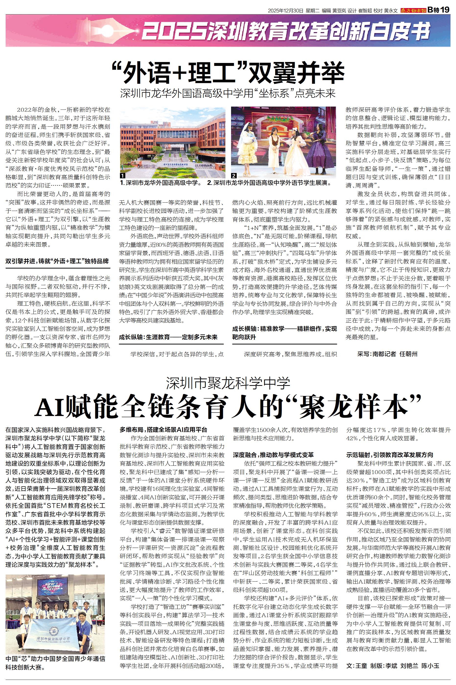 在国家深入实施科教兴国战略背景下,深圳市聚龙科学中学(以下简称“聚龙科中”)将人工智能教育置于国家创新驱动发展战略与深圳先行示范教育高地建设的双重坐标系中,以理论创新为引领,以实践突破为驱动,在个