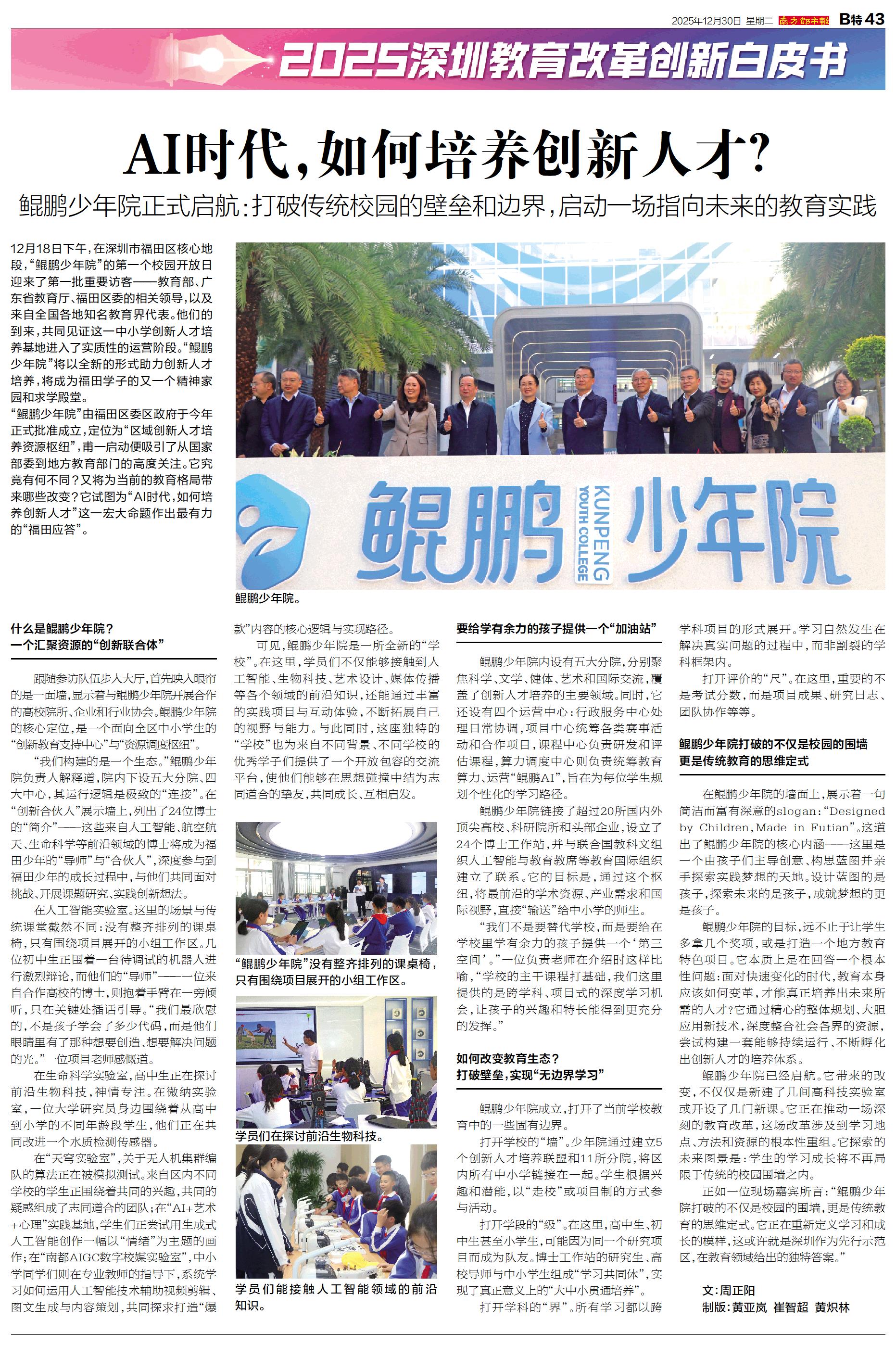 12月18日下午,在深圳市福田区核心地段,“鲲鹏少年院”的第一个校园开放日迎来了第一批重要访客——教育部、广东省教育厅、福田区委的相关领导,以及来自全国各地知名教育界代表。他们的到来,共同见证这一