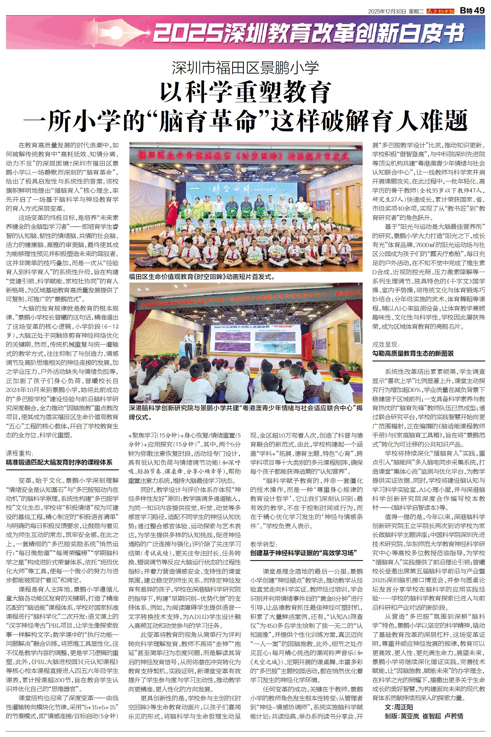 在教育高质量发展的时代浪潮中,如何破解传统教育中“高耗低效、知情分离、动力不足”的深层困境?深圳市福田区景鹏小学以一场静默而深刻的“脑育革命”,给出了极具启发性与系统性的答案。该校旗帜鲜明地提出“