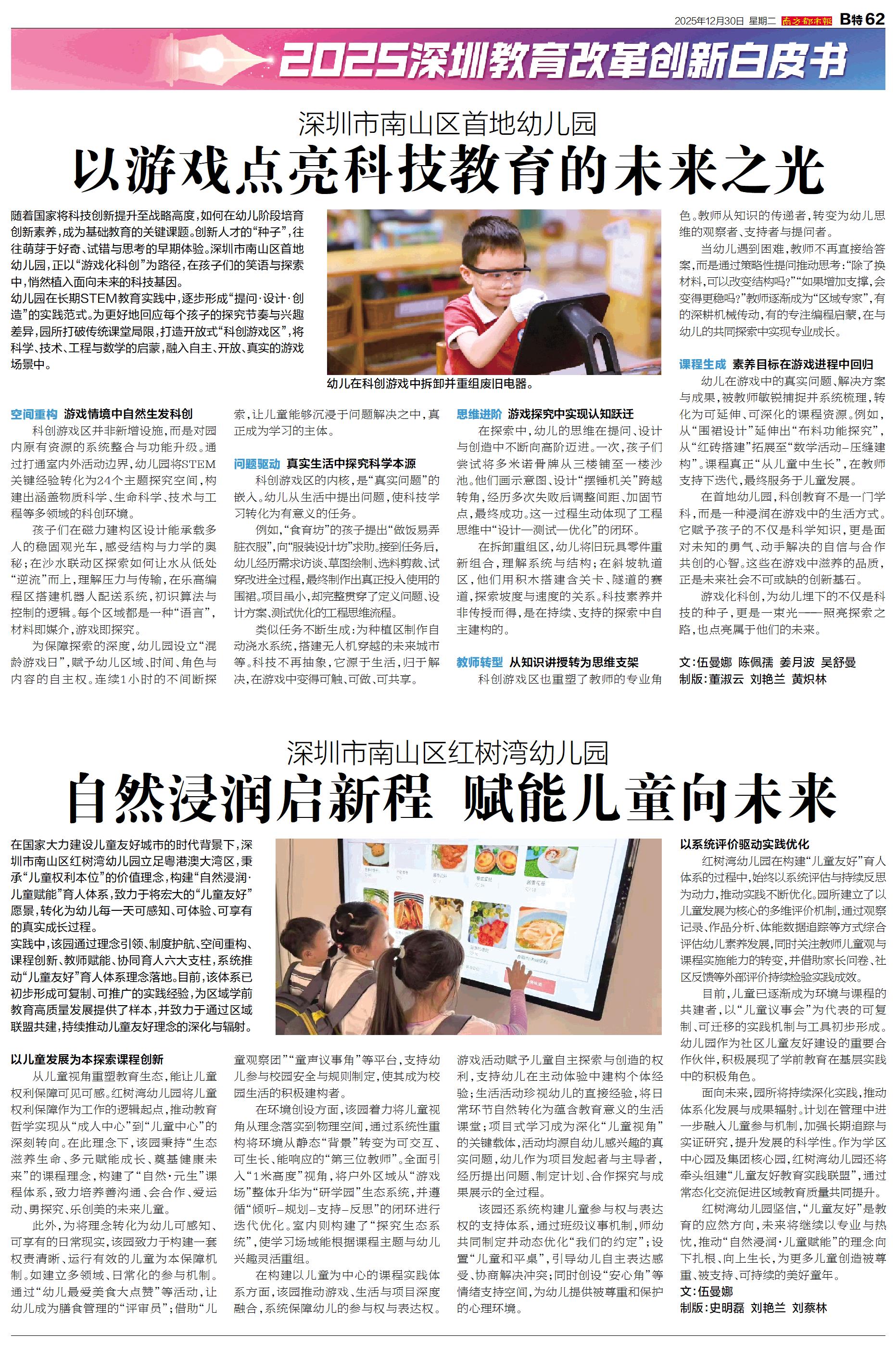 在国家大力建设儿童友好城市的时代背景下,深圳市南山区红树湾幼儿园立足粤港澳大湾区,秉承“儿童权利本位”的价值理念,构建“自然浸润·儿童赋能”育人体系,致力于将宏大的“儿童友好”愿景,转化为幼儿每一