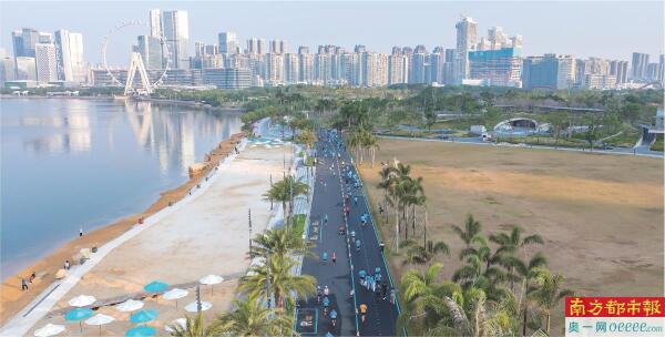 将视线拉高,俯瞰当天的5公里赛道,一幅极具现代感的城市画卷徐徐展开:一边是波光粼粼的前海湾,摩天轮“湾区之光”在晨曦中转动;另一边是错落有致的摩天大楼与绿意盎然的滨海公园。