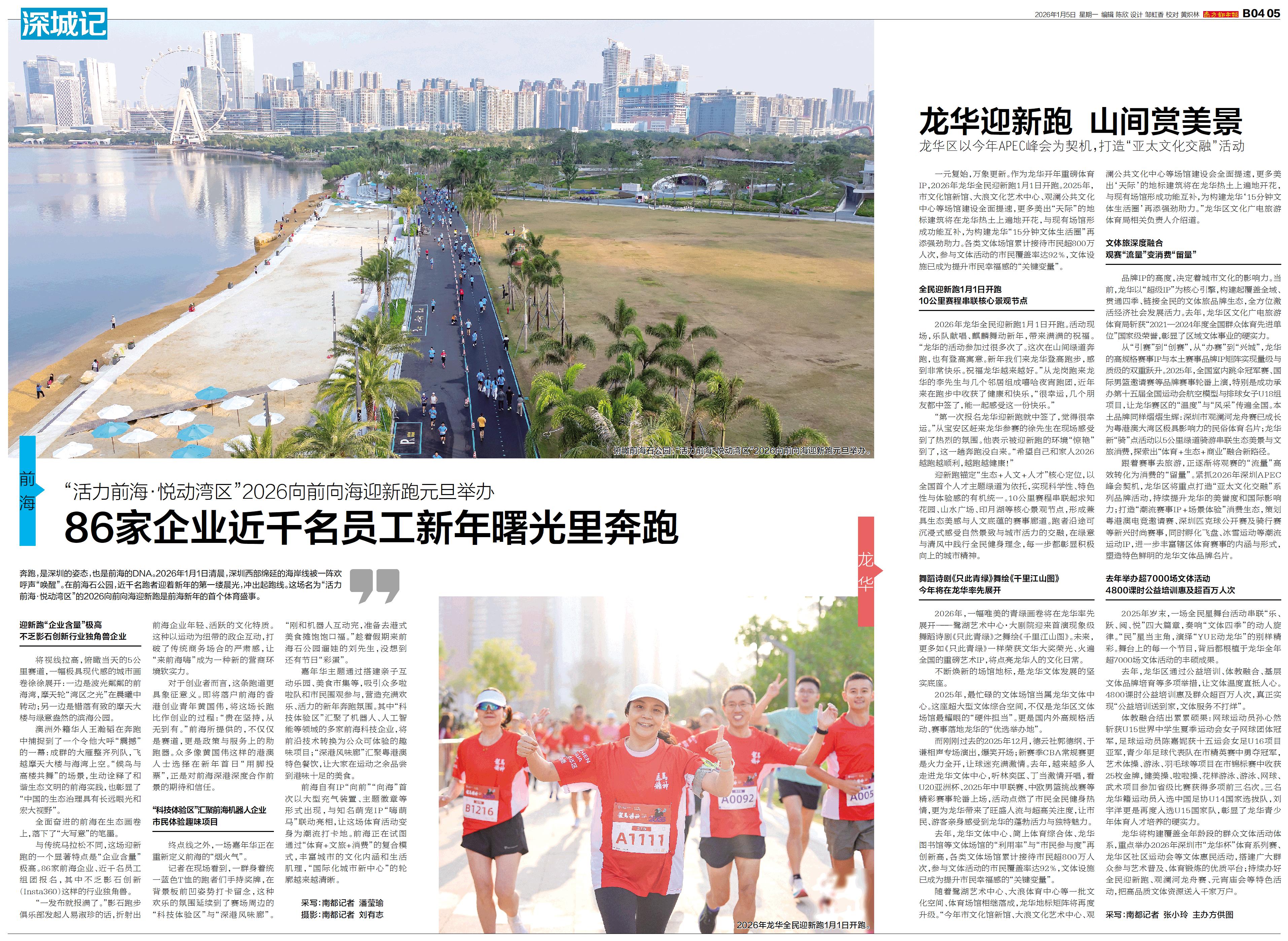 龙 华 一元复始,万象更新。作为龙华开年重磅体育IP,2026年龙华全民迎新跑1月1日开跑。2025年,市文化馆新馆、大浪文化艺术中心、观澜公共文化中心等场馆建设全面提速,更多美出“天际”的地标