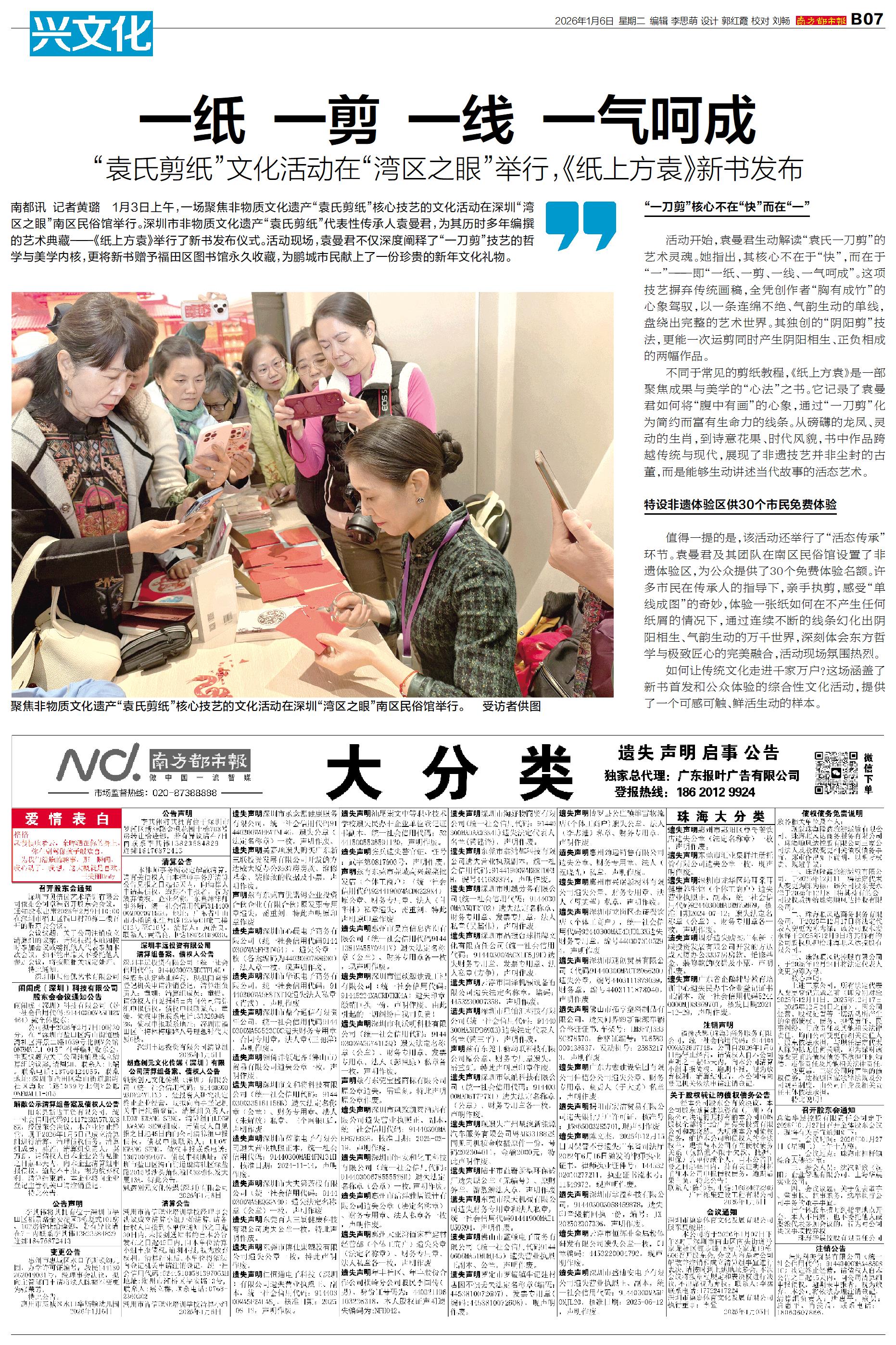 南都讯 记者黄璐 1月3日上午,一场聚焦非物质文化遗产“袁氏剪纸”核心技艺的文化活动在深圳“湾区之眼”南区民俗馆举行。深圳市非物质文化遗产“袁氏剪纸”代表性传承人袁曼君,为其历时多年编撰的艺术典藏