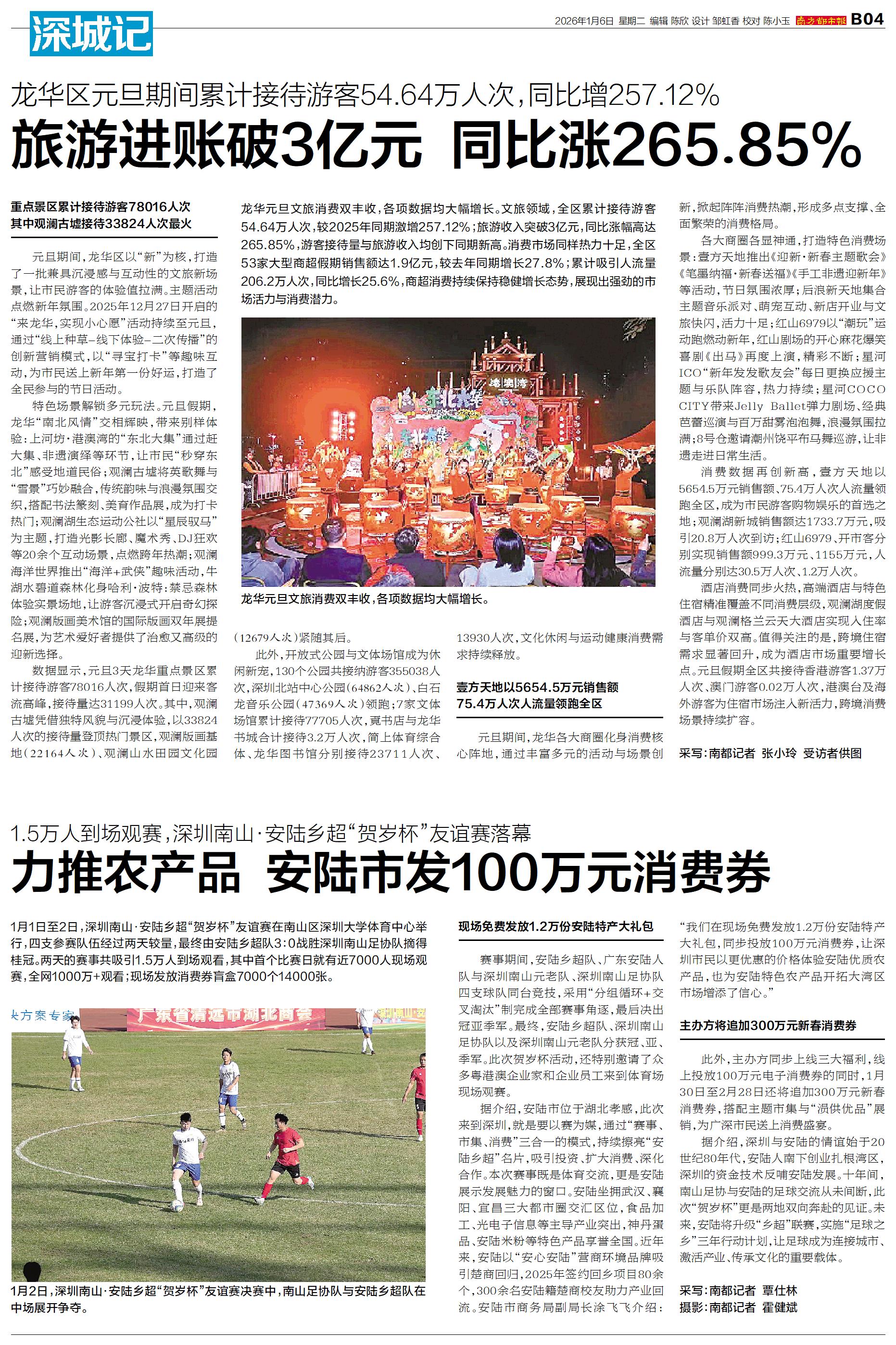 龙华元旦文旅消费双丰收,各项数据均大幅增长。文旅领域,全区累计接待游客54.64万人次,较2025年同期激增257.12%;旅游收入突破3亿元,同比涨幅高达265.85%,游客接待量与旅游收入均创