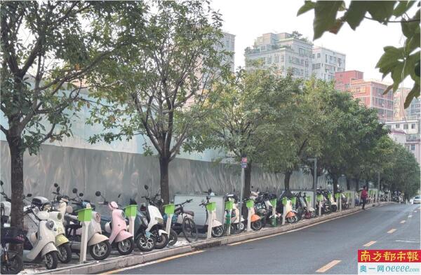 2025年12月24日,南都奥一新闻记者在现场看到,和风轩小区外的岭南路人行道上,排列着不同运营商建设的充电桩,不少区域同时存在多个品牌设施。