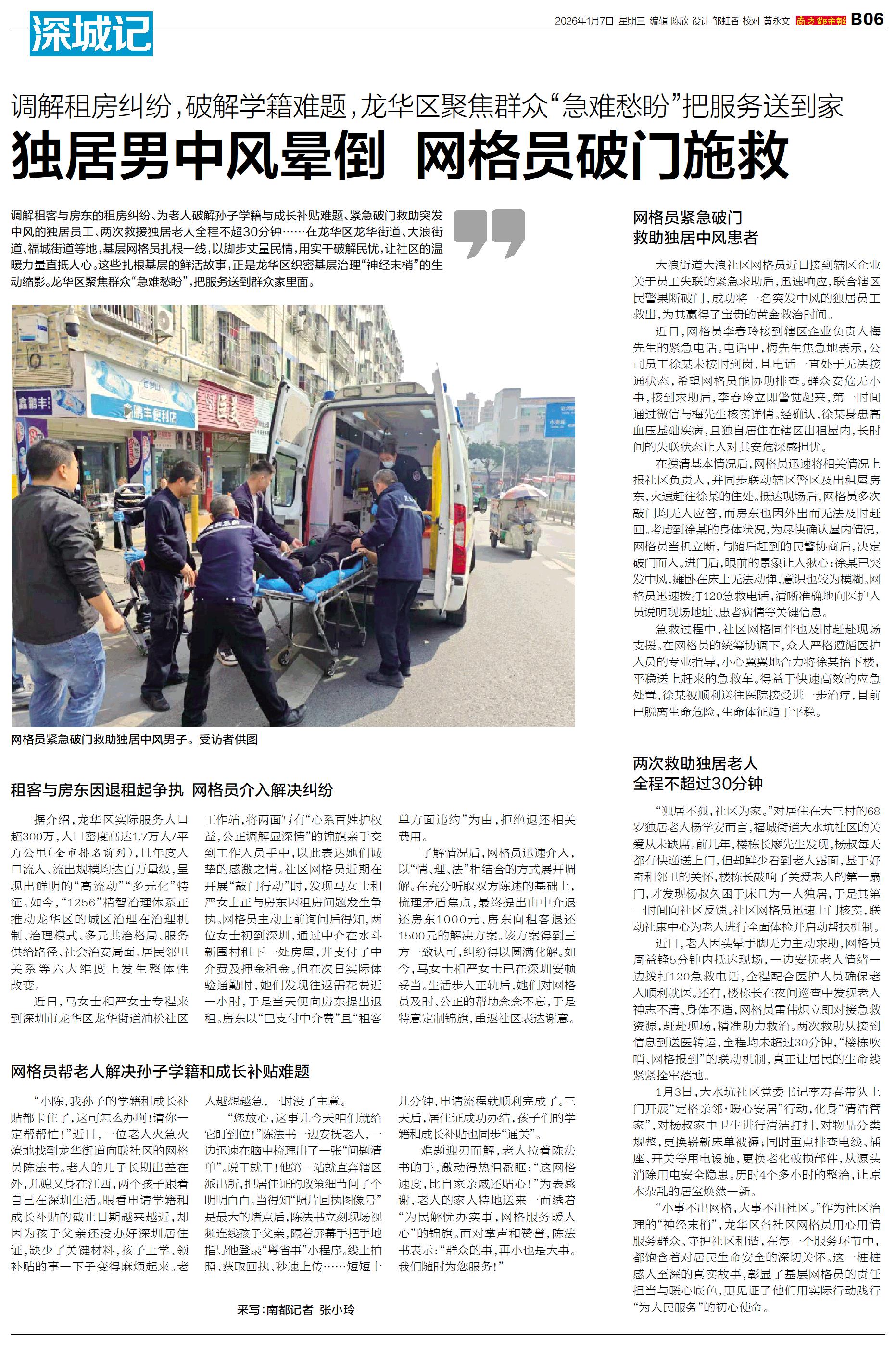调解租客与房东的租房纠纷、为老人破解孙子学籍与成长补贴难题、紧急破门救助突发中风的独居员工、两次救援独居老人全程不超30分钟……在龙华区龙华街道、大浪街道、福城街道等地,基层网格员扎根一线,以脚步