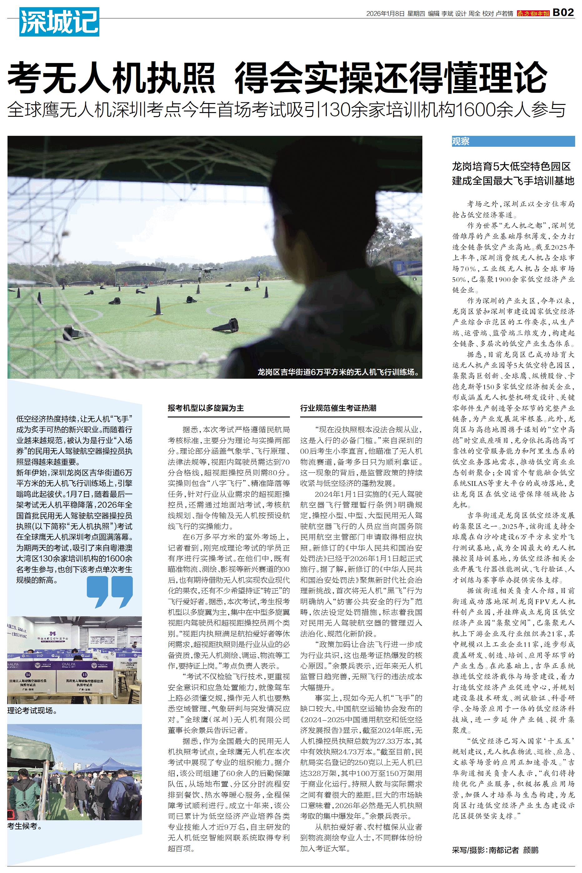 低空经济热度持续,让无人机“飞手”成为炙手可热的新兴职业。而随着行业越来越规范,被认为是行业“入场券”的民用无人驾驶航空器操控员执照显得越来越重要。 新年伊始,深圳龙岗区吉华街道6万平方米的无人