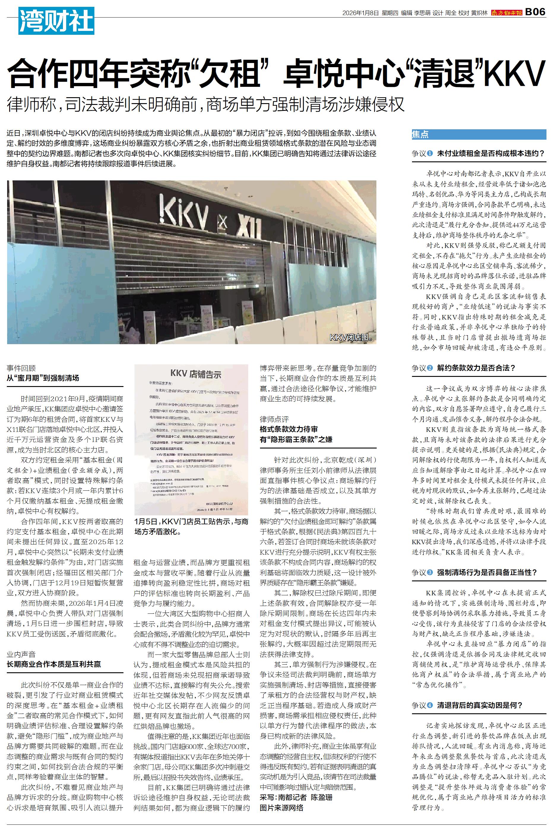 近日,深圳卓悦中心与KKV的闭店纠纷持续成为商业舆论焦点。从最初的“暴力闭店”控诉,到如今围绕租金条款、业绩认定、解约时效的多维度博弈,这场商业纠纷暴露双方核心矛盾之余,也折射出商业租赁领域格式条