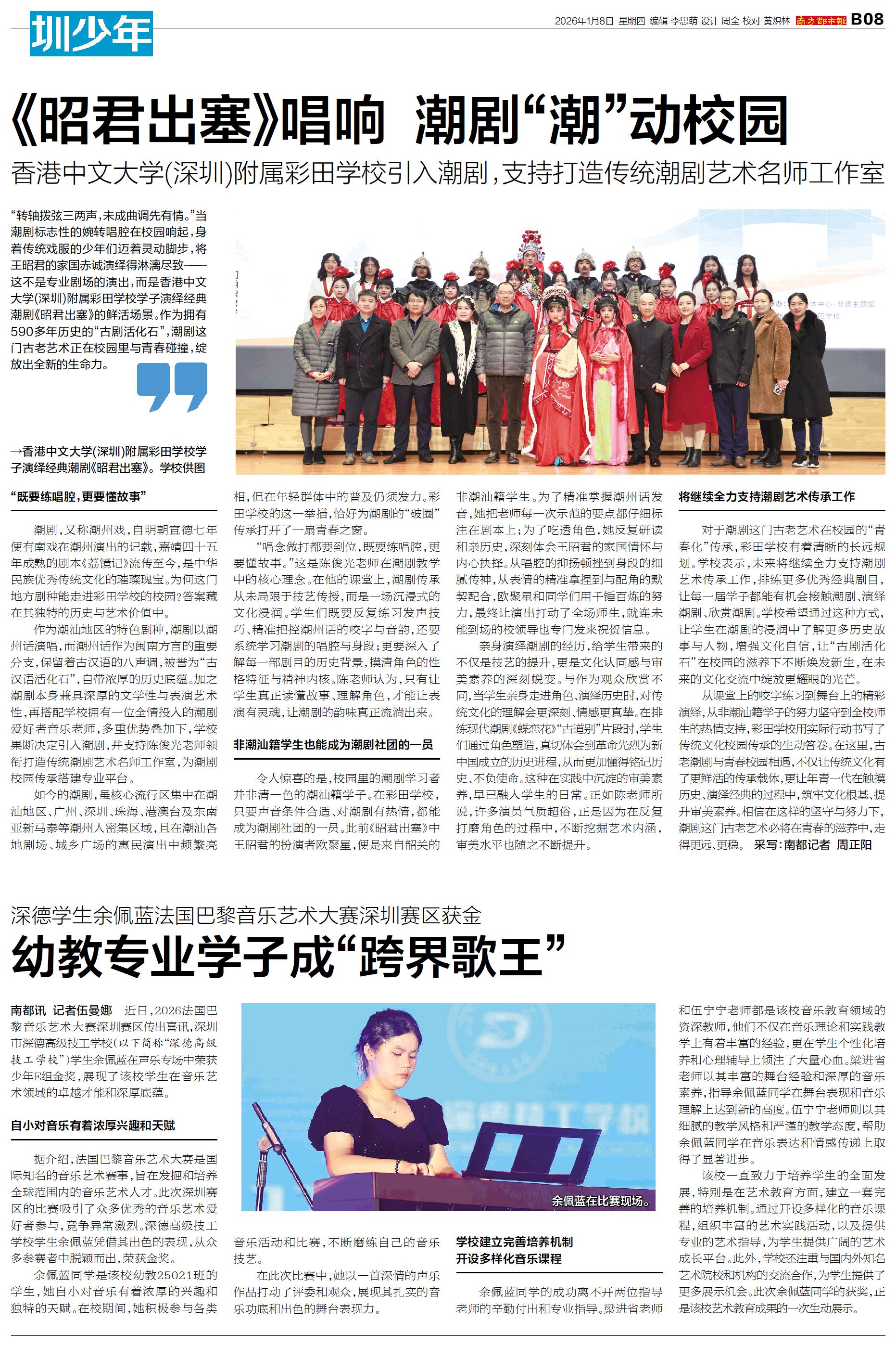 南都讯 记者伍曼娜 近日,2026法国巴黎音乐艺术大赛深圳赛区传出喜讯,深圳市深德高级技工学校(以下简称“深德高级技工学校”)学生余佩蓝在声乐专场中荣获少年E组金奖,展现了该校学生在音乐艺术领域的