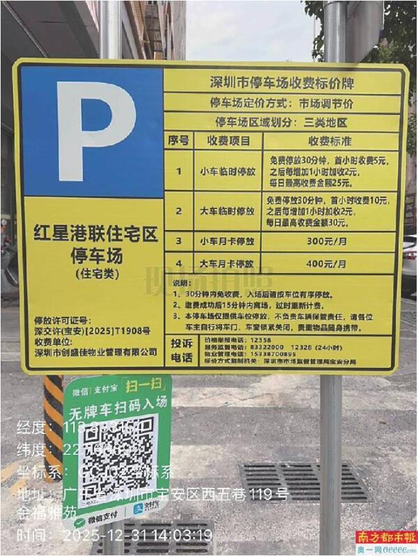 对此,属地管理部门宝安区松岗街道办作出了回应。据介绍,红星港联住宅区为深圳市松岗红星股份合作公司集体用地,已委托深圳市创盛佳物业管理有限公司对该集体用地实施围合式停车规范管理,已于2025年11月27日取得《深圳市经营性停车场许可证》[深交许(宝安)【2025】T1908号]。