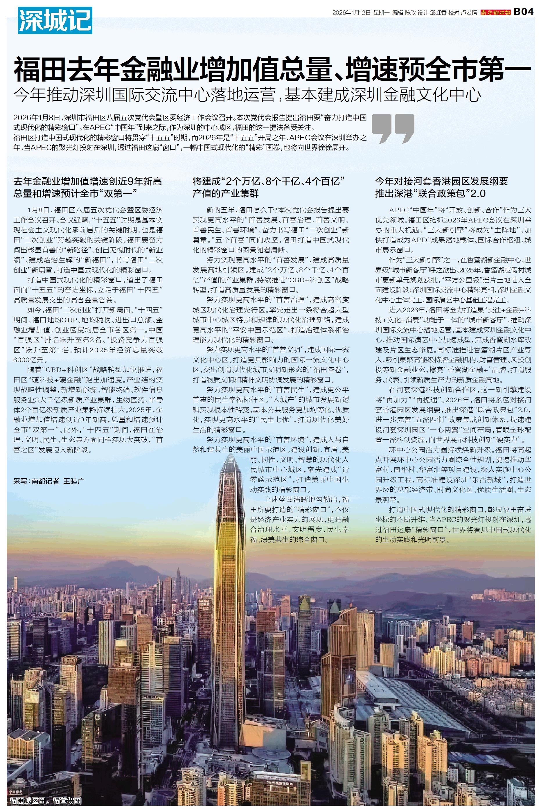 2026年1月8日,深圳市福田区八届五次党代会暨区委经济工作会议召开。本次党代会报告提出福田要“奋力打造中国式现代化的精彩窗口”。在APEC“中国年”到来之际,作为深圳的中心城区,福田的这一提法备
