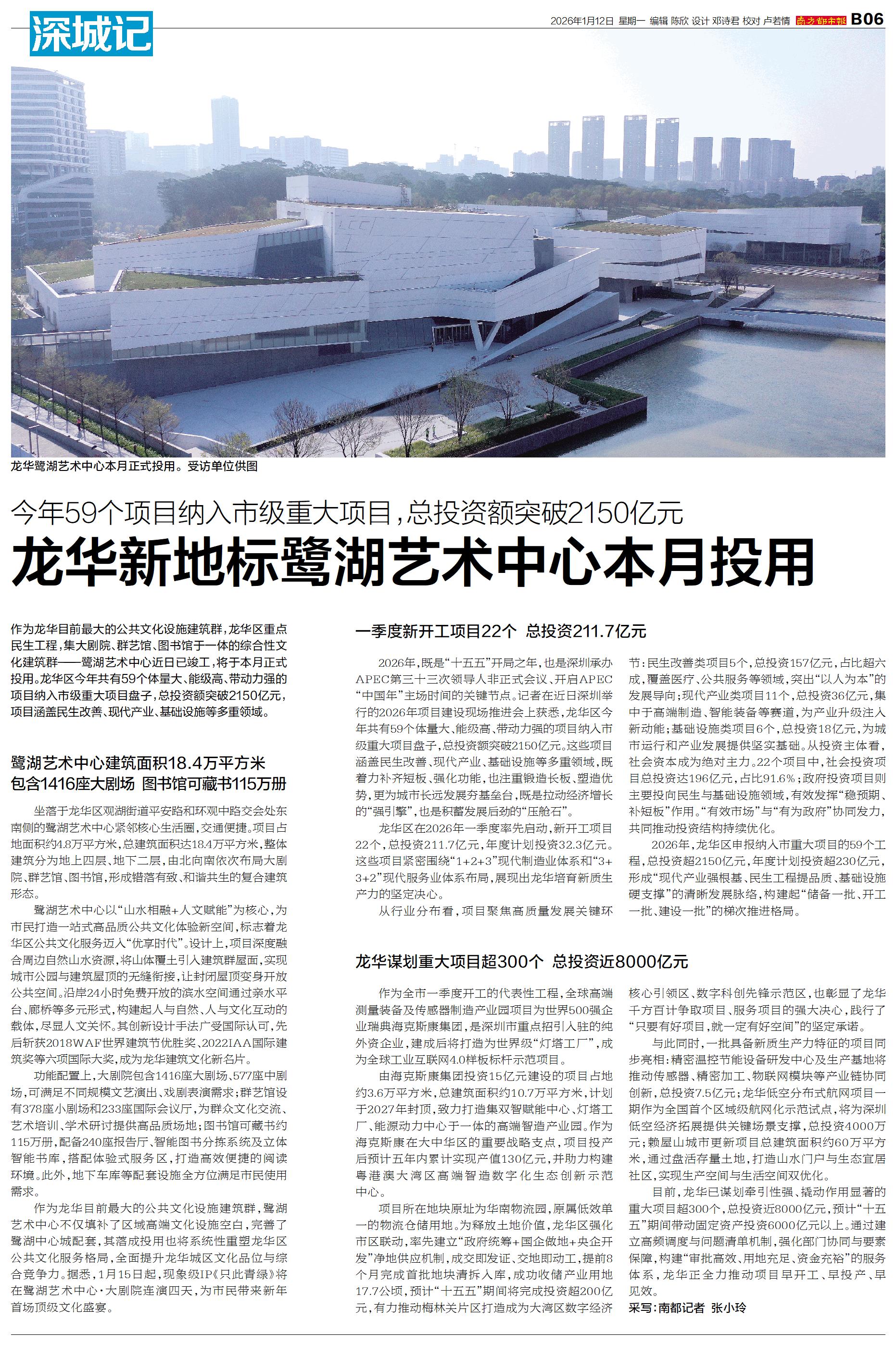 作为龙华目前最大的公共文化设施建筑群,龙华区重点民生工程,集大剧院、群艺馆、图书馆于一体的综合性文化建筑群——鹭湖艺术中心近日已竣工,将于本月正式投用。龙华区今年共有59个体量大、能级高、带动力强