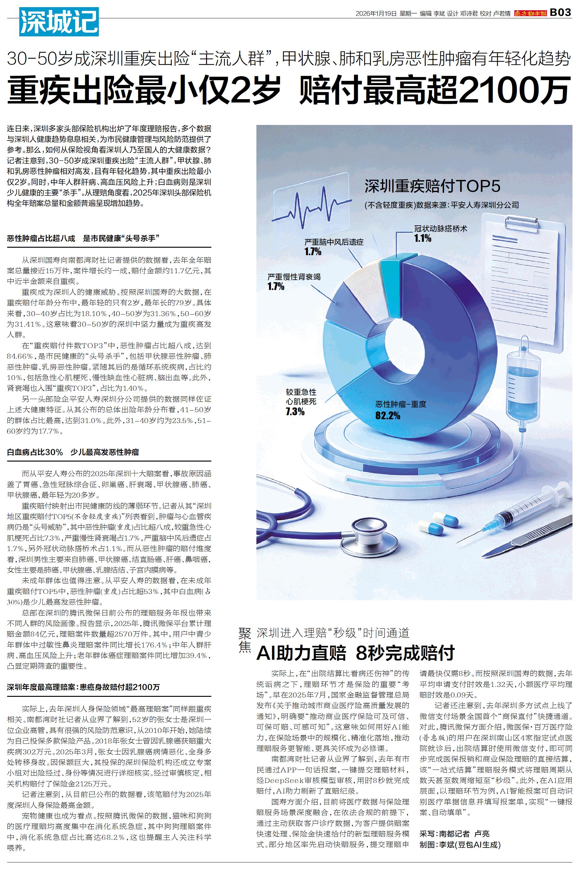 连日来,深圳多家头部保险机构出炉了年度理赔报告,多个数据与深圳人健康趋势息息相关,为市民健康管理与风险防范提供了参考。那么,如何从保险视角看深圳人乃至国人的大健康数据?记者注意到,30-50岁成深圳重疾出险“主流人群”,甲状腺、肺和乳房恶性肿瘤相对高发,且有年轻化趋势,其中重疾出险最小仅2岁。同时,中年人群肝病、高血压风险上升;白血病则是深圳少儿健康的主要“杀手”。从理赔角度看,2025年深圳头部保险机构全年赔案总量和金额普遍呈现增加趋势。