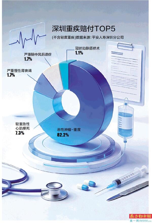 重疾赔付映射出市民健康防线的薄弱环节。记者从其“深圳地区重疾赔付TOP5(不含轻度重疾)”列表看到,肿瘤与心血管疾病仍是“头号威胁”,其中恶性肿瘤(重度)占比超八成,较重急性心肌梗死占比7.3%,严重慢性肾衰竭占1.7%,严重脑中风后遗症占1.7%,另外冠状动脉搭桥术占1.1%。而从恶性肿瘤的赔付维度看,深圳男性主要来自肺癌、甲状腺癌、结直肠癌、肝癌、鼻咽癌,女性主要是肺癌、甲状腺癌、乳腺结结、子宫内膜病等。