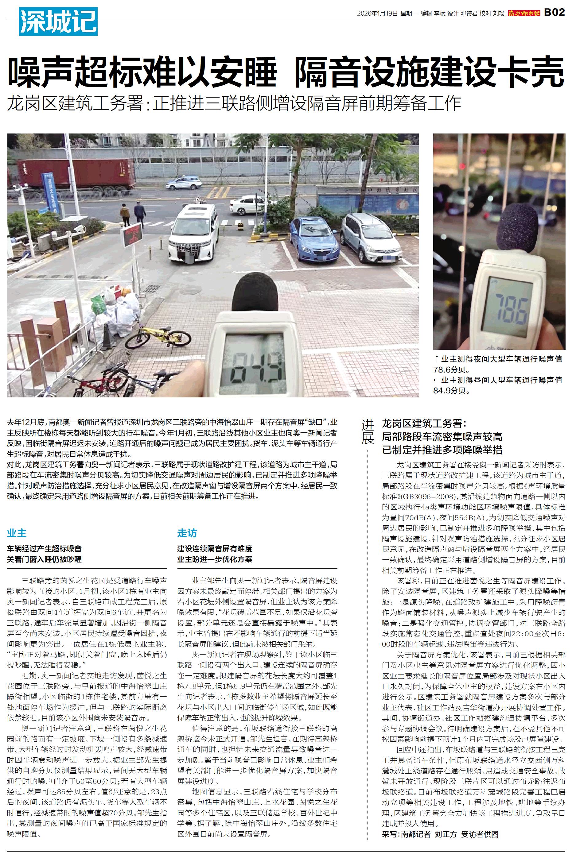 去年12月底,南都奥一新闻记者曾报道深圳市龙岗区三联路旁的中海怡翠山庄一期存在隔音屏“缺口”,业主反映所在楼栋每天都能听到较大的行车噪音。今年1月初,三联路沿线其他小区业主也向奥一新闻记者反映,因
