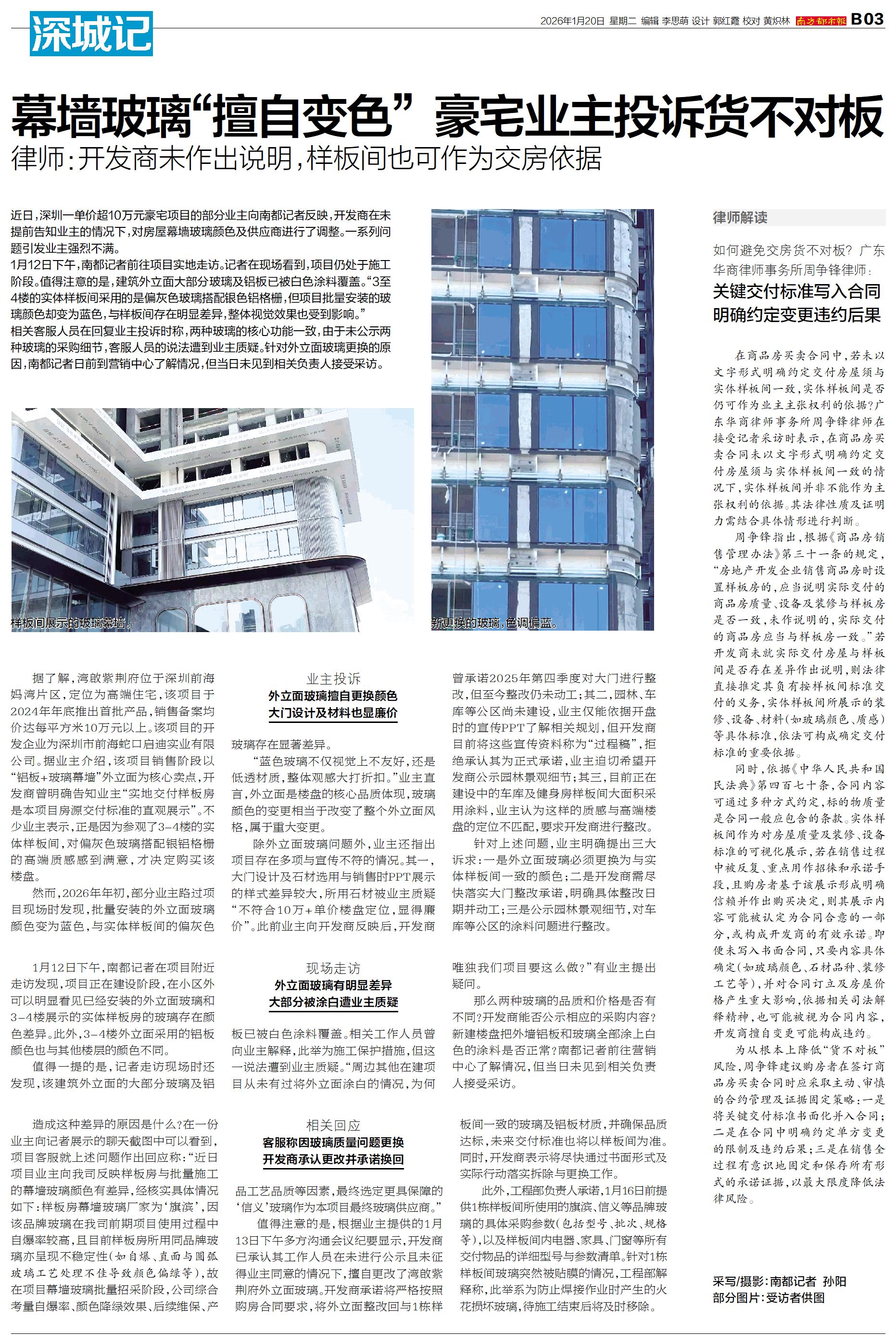 近日,深圳一单价超10万元豪宅项目的部分业主向南都记者反映,开发商在未提前告知业主的情况下,对房屋幕墙玻璃颜色及供应商进行了调整。一系列问题引发业主强烈不满。 1月12日下午,南都记者前往项目实