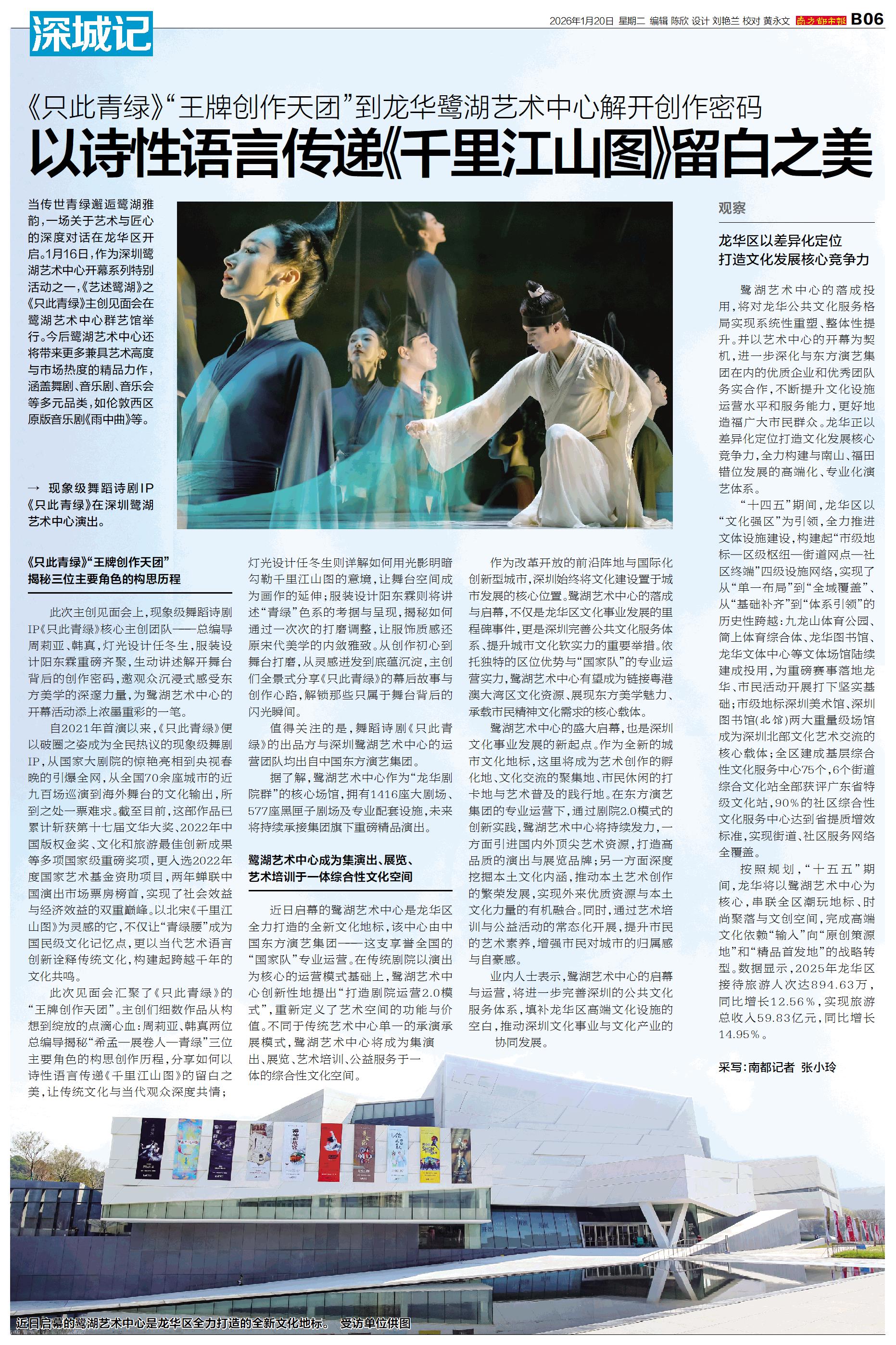 当传世青绿邂逅鹭湖雅韵,一场关于艺术与匠心的深度对话在龙华区开启。1月16日,作为深圳鹭湖艺术中心开幕系列特别活动之一,《艺述鹭湖》之《只此青绿》主创见面会在鹭湖艺术中心群艺馆举行。今后鹭湖艺术中