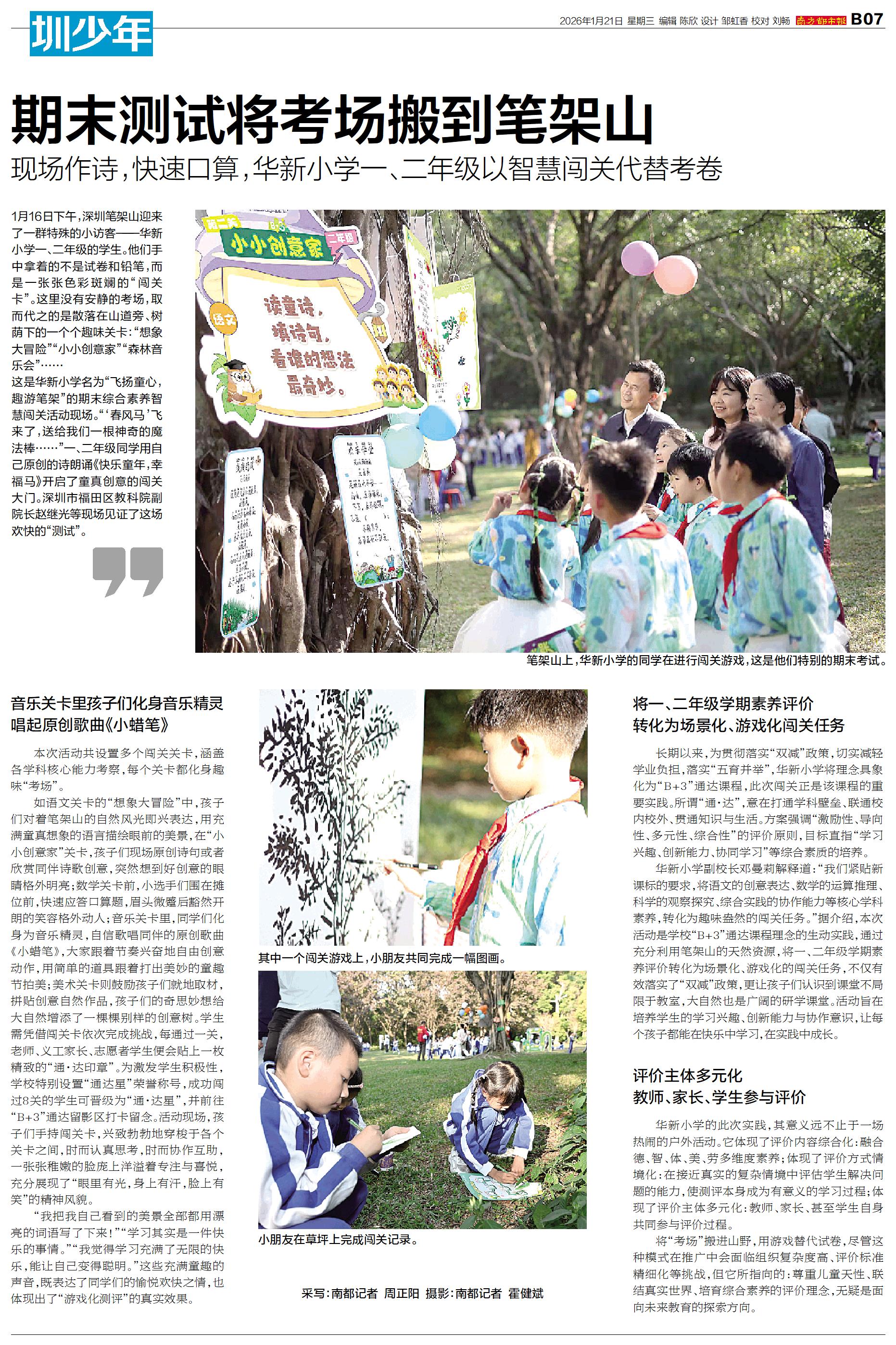 1月16日下午,深圳笔架山迎来了一群特殊的小访客——华新小学一、二年级的学生。他们手中拿着的不是试卷和铅笔,而是一张张色彩斑斓的“闯关卡”。这里没有安静的考场,取而代之的是散落在山道旁、树荫下的一