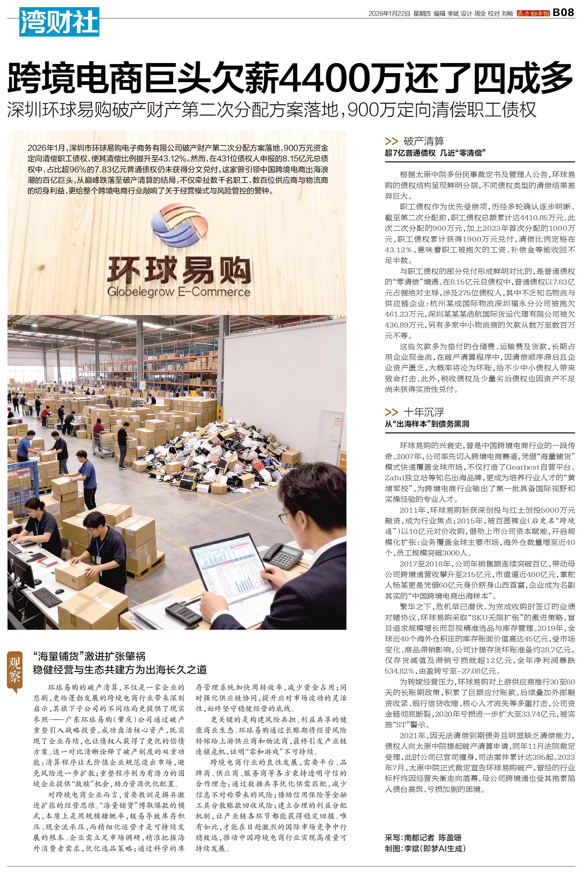2026年1月,深圳市环球易购电子商务有限公司破产财产第二次分配方案落地,900万元资金定向清偿职工债权,使其清偿比例提升至43.12%。然而,在431位债权人申报的8.15亿元总债权中,占比超9