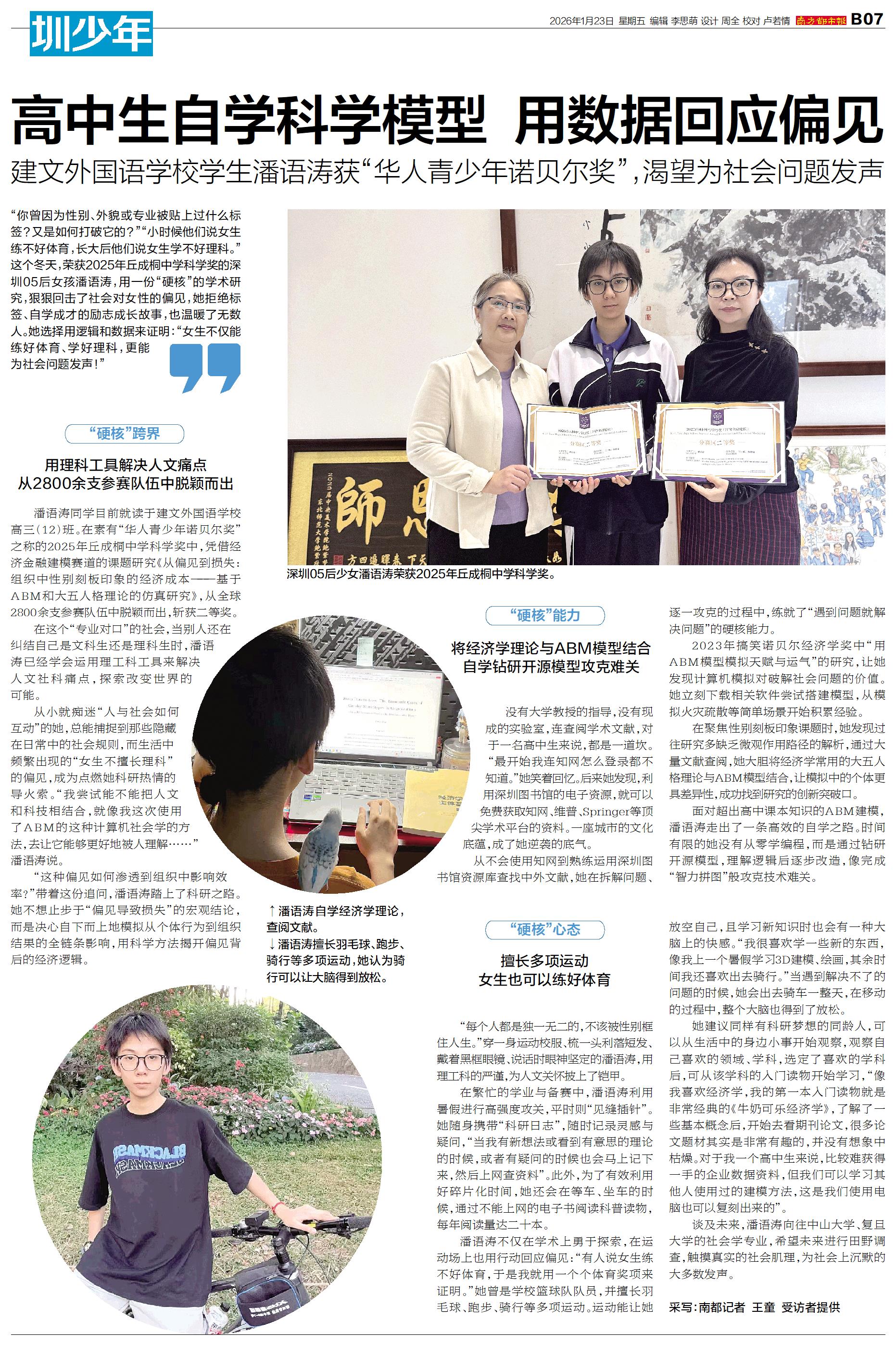 “你曾因为性别、外貌或专业被贴上过什么标签?又是如何打破它的?”“小时候他们说女生练不好体育,长大后他们说女生学不好理科。”这个冬天,荣获2025年丘成桐中学科学奖的深圳05后女孩潘语涛,用一份“