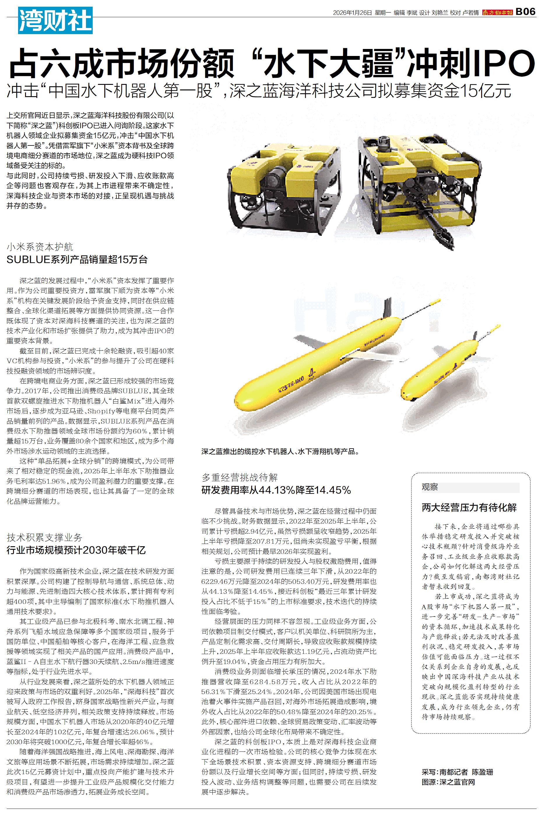 上交所官网近日显示,深之蓝海洋科技股份有限公司(以下简称“深之蓝”)科创板IPO已进入问询阶段。这家水下机器人领域企业拟募集资金15亿元,冲击“中国水下机器人第一股”。凭借雷军旗下“小米系”资本背