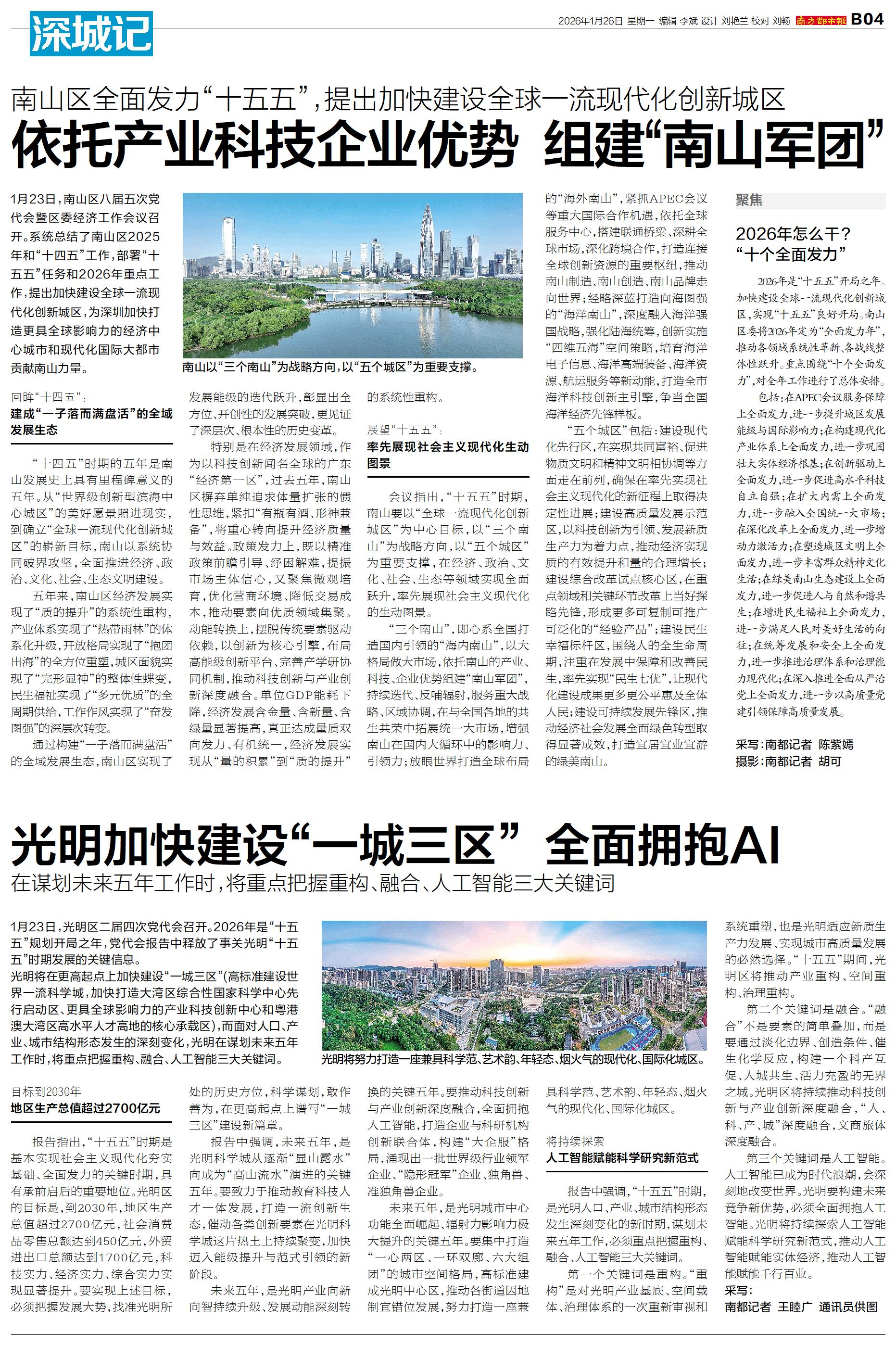1月23日,南山区八届五次党代会暨区委经济工作会议召开。系统总结了南山区2025年和“十四五”工作,部署“十五五”任务和2026年重点工作,提出加快建设全球一流现代化创新城区,为深圳加快打造更具全