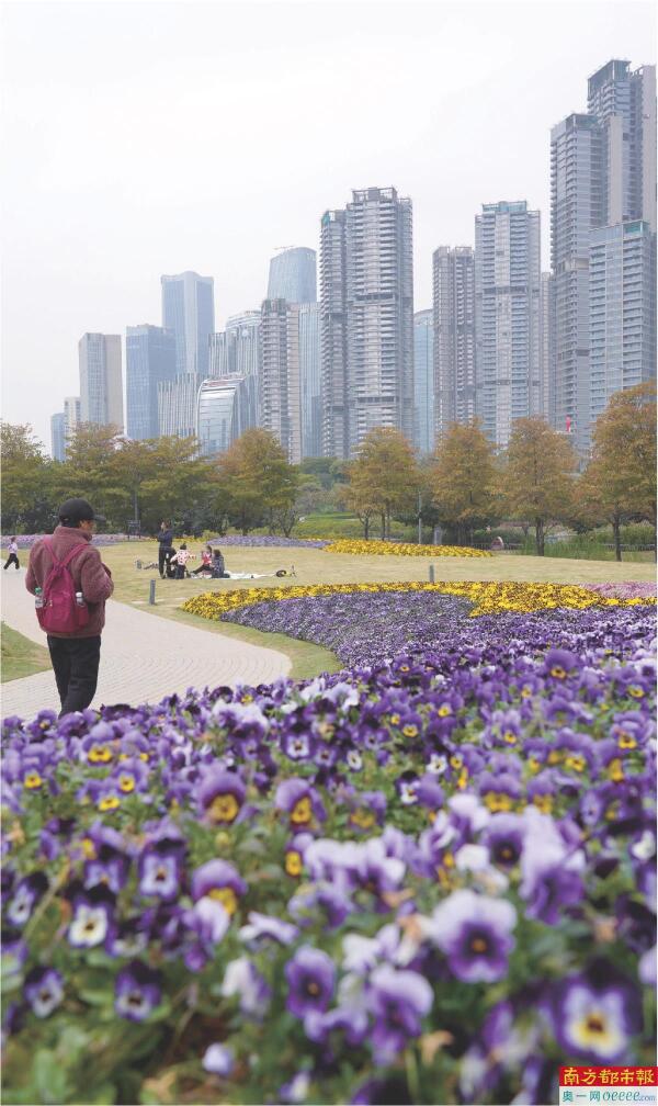 “四九”严寒威力全开,深圳的气温一度下探至7摄氏度,但在前海,一场关于“时间与色彩”的展览正在上演。在前海桂湾河南街往东的一个角落,坐落着一座闹中取静的紫荆园。1月22日,南都记者走在花园蜿蜒的小径上,寒风把树枝吹得一颤一颤的,但眼前的景色却暖意融融。为了应对低温,园林养护方换上了冬季限定皮肤,大片黄色的角堇、紫色的小花与粉紫色的花带交织,像极了莫奈笔下的油画。这里紧邻前海国际会议中心,与桂湾公园连成一体。起伏的坡地花海制造了天然的景深,一座透着浓郁“唐代风韵”的古朴亭子伫立其中,仿佛穿越回了长安城的某个春日午后。市民们也是懂出片的,一位热情的阿姨向记者分享了她的“独家出片秘籍”,“坡顶俯拍”“花田小径”都是最佳机位。在亭边栏杆一坐,背景是摩天大楼与花海,随手一拍,便是一张颇具“赛博田园”风格的人生大片。