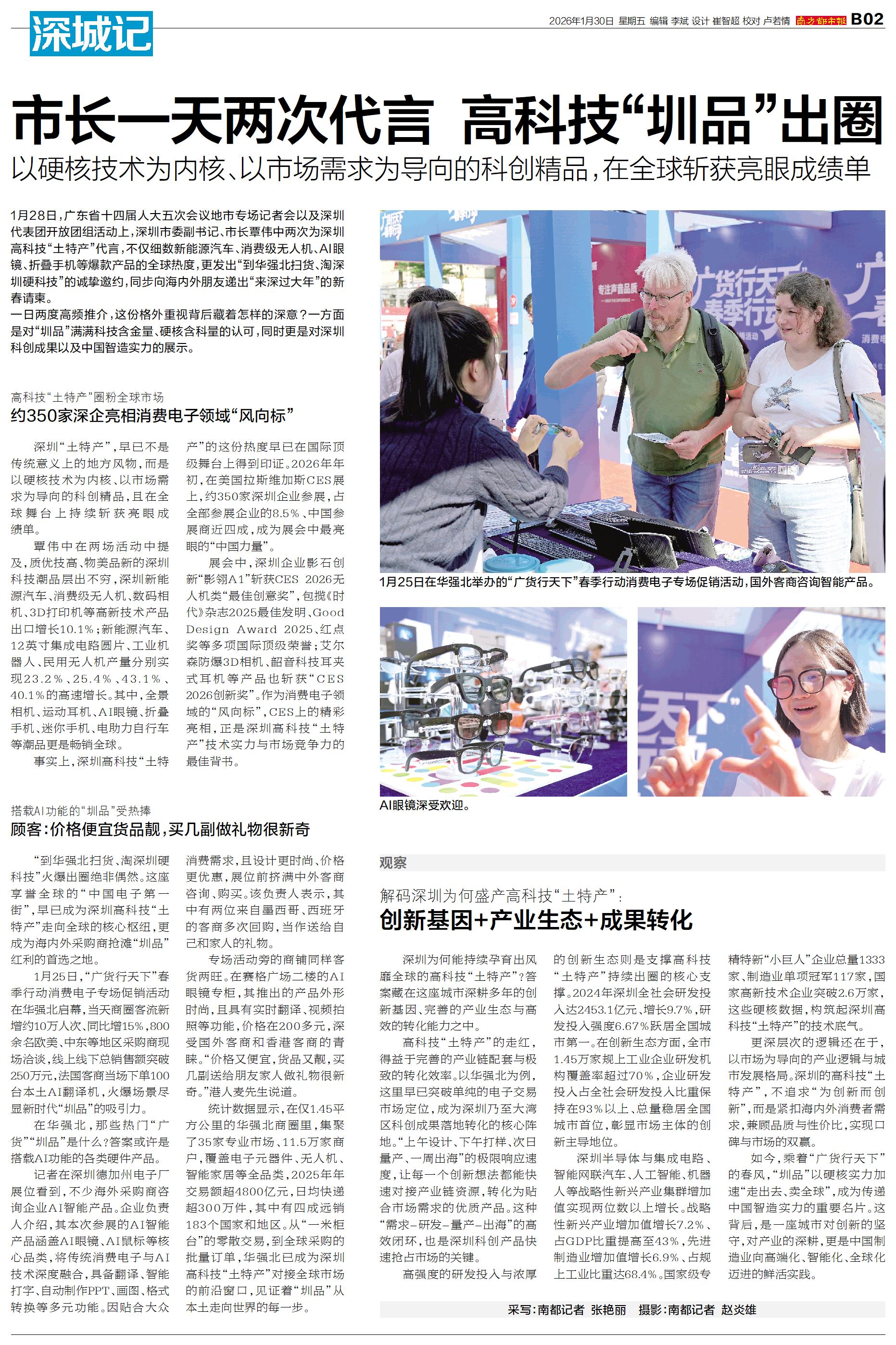 1月28日,广东省十四届人大五次会议地市专场记者会以及深圳代表团开放团组活动上,深圳市委副书记、市长覃伟中两次为深圳高科技“土特产”代言,不仅细数新能源汽车、消费级无人机、AI眼镜、折叠手机等爆款