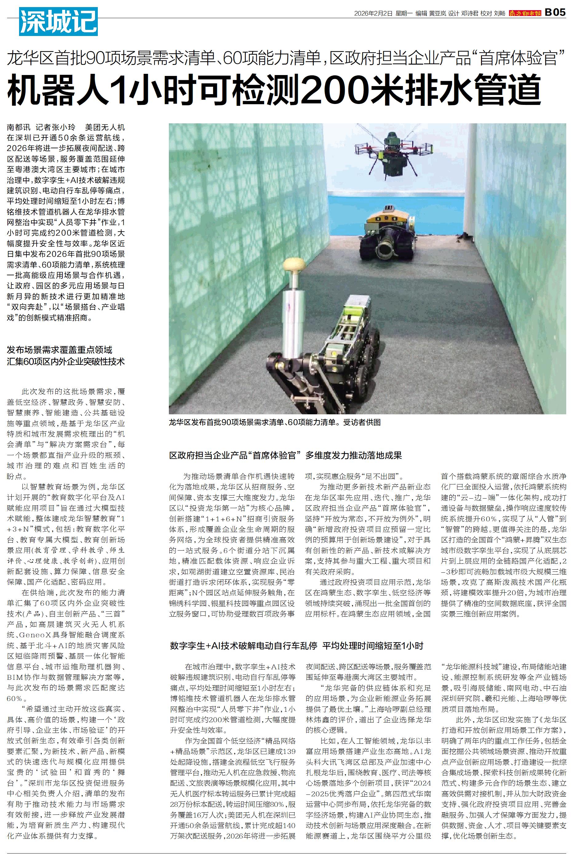 南都讯 记者张小玲 美团无人机在深圳已开通50余条运营航线,2026年将进一步拓展夜间配送、跨区配送等场景,服务覆盖范围延伸至粤港澳大湾区主要城市;在城市治理中,数字孪生+AI技术破解违规建筑识
