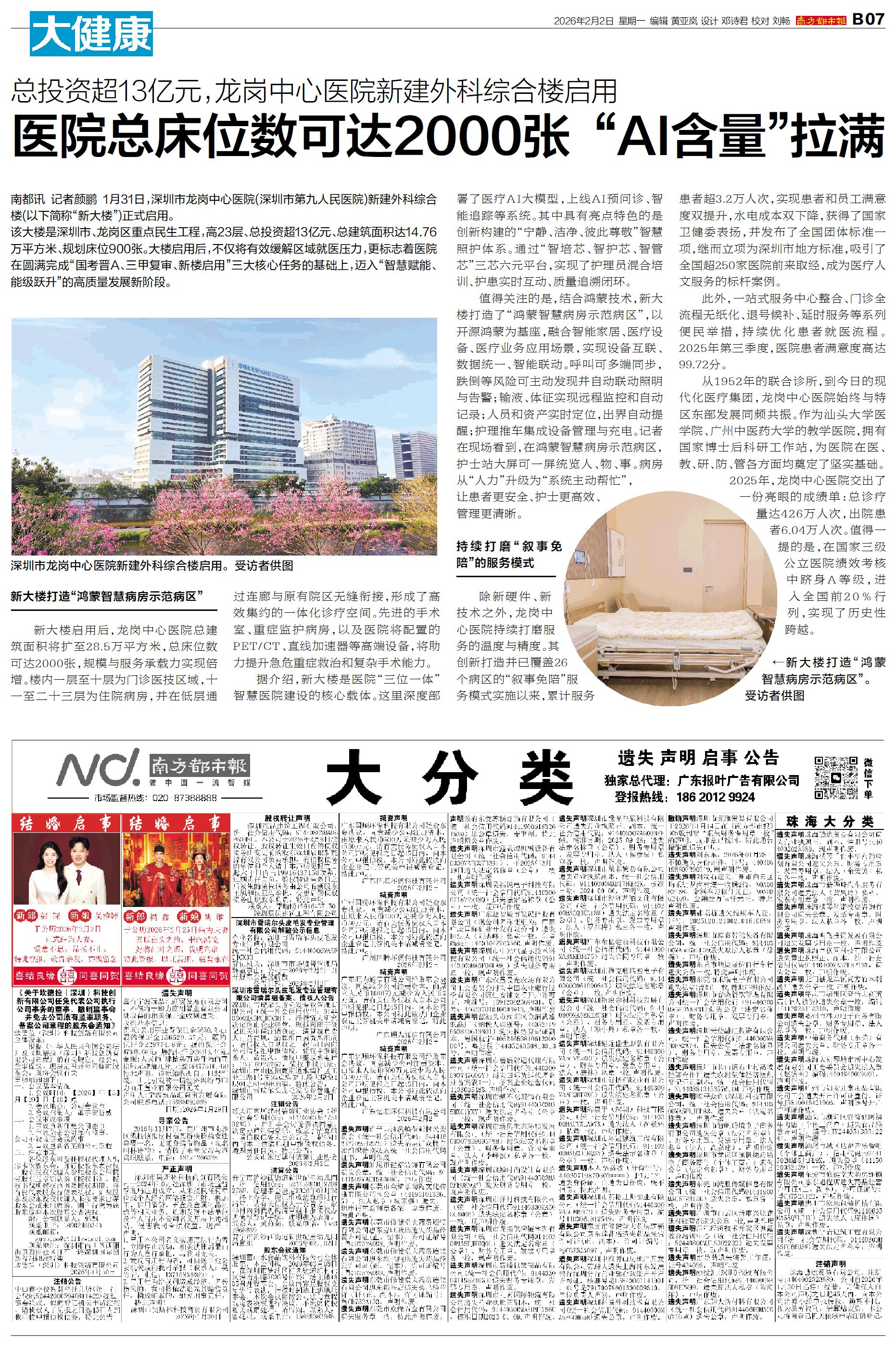 南都讯 记者颜鹏 1月31日,深圳市龙岗中心医院(深圳市第九人民医院)新建外科综合楼(以下简称“新大楼”)正式启用。 该大楼是深圳市、龙岗区重点民生工程,高23层、总投资超13亿元、总建筑面积达