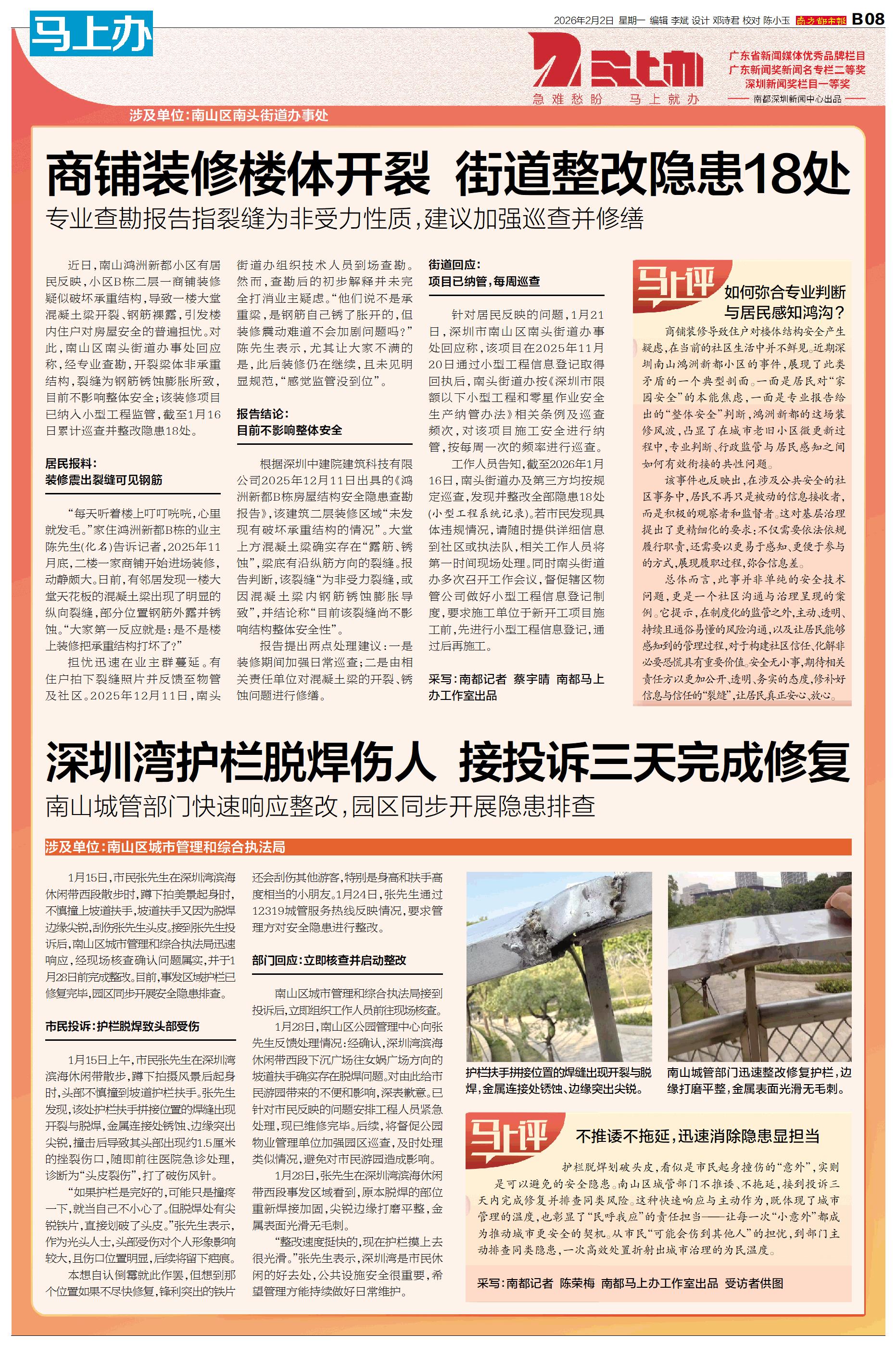 涉及单位:南山区城市管理和综合执法局 1月15日,市民张先生在深圳湾滨海休闲带西段散步时,蹲下拍美景起身时,不慎撞上坡道扶手,坡道扶手又因为脱焊边缘尖锐,刮伤张先生头皮。接到张先生投诉后,南山区