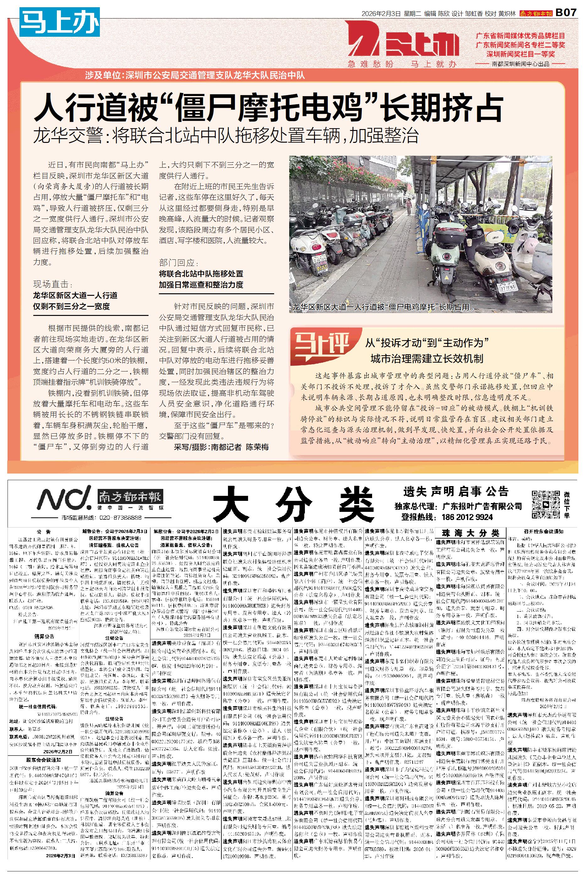 涉及单位:深圳市公安局交通管理支队龙华大队民治中队 近日,有市民向南都“马上办”栏目反映,深圳市龙华区新区大道(向荣商务大厦旁)的人行道被长期占用,停放大量“僵尸摩托车”和“电鸡”,导致人行道被