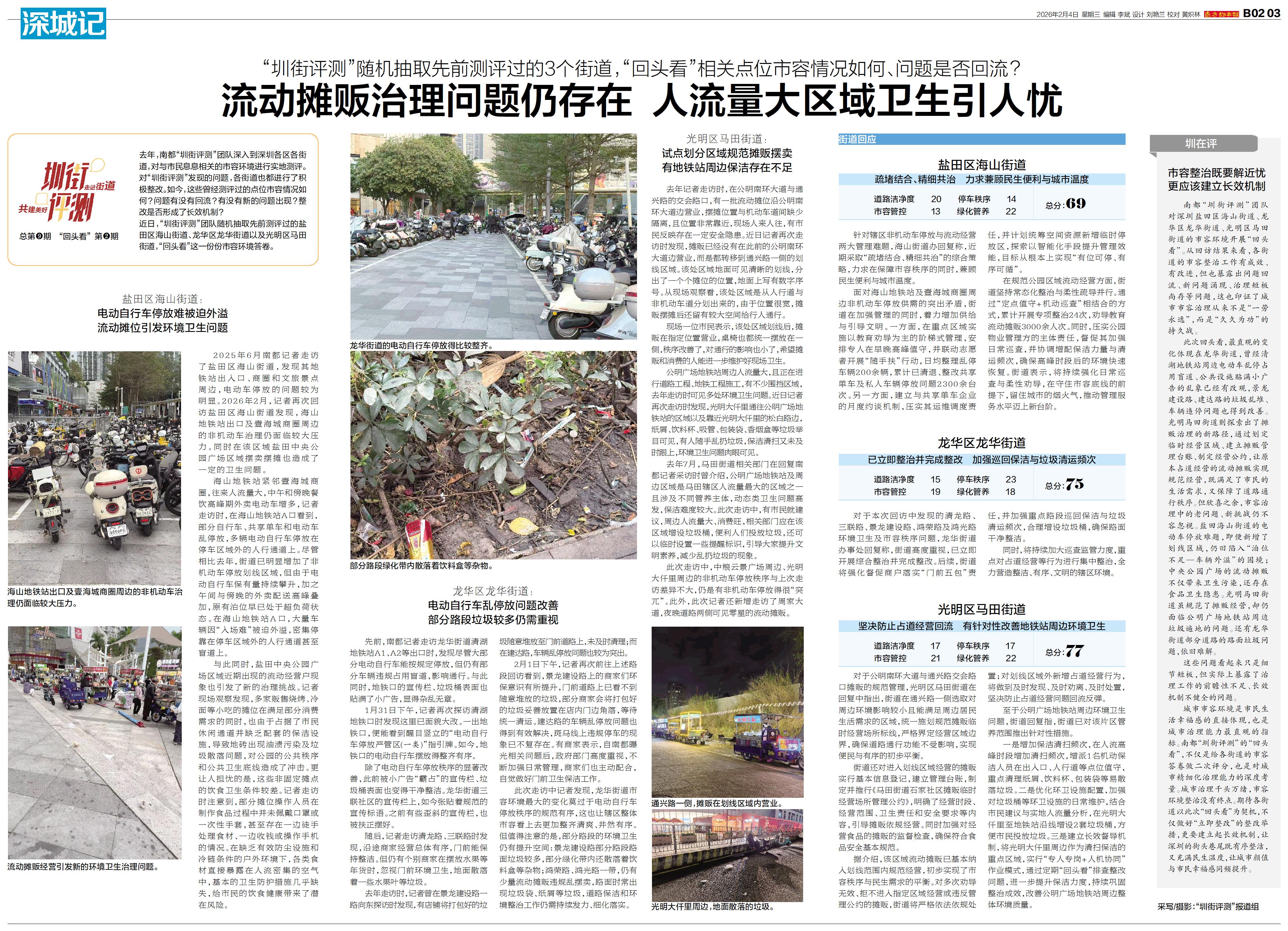 去年,南都“圳街评测”团队深入到深圳各区各街道,对与市民息息相关的市容环境进行实地测评。对“圳街评测”发现的问题,各街道也都进行了积极整改。如今,这些曾经测评过的点位市容情况如何?问题有没有回流?