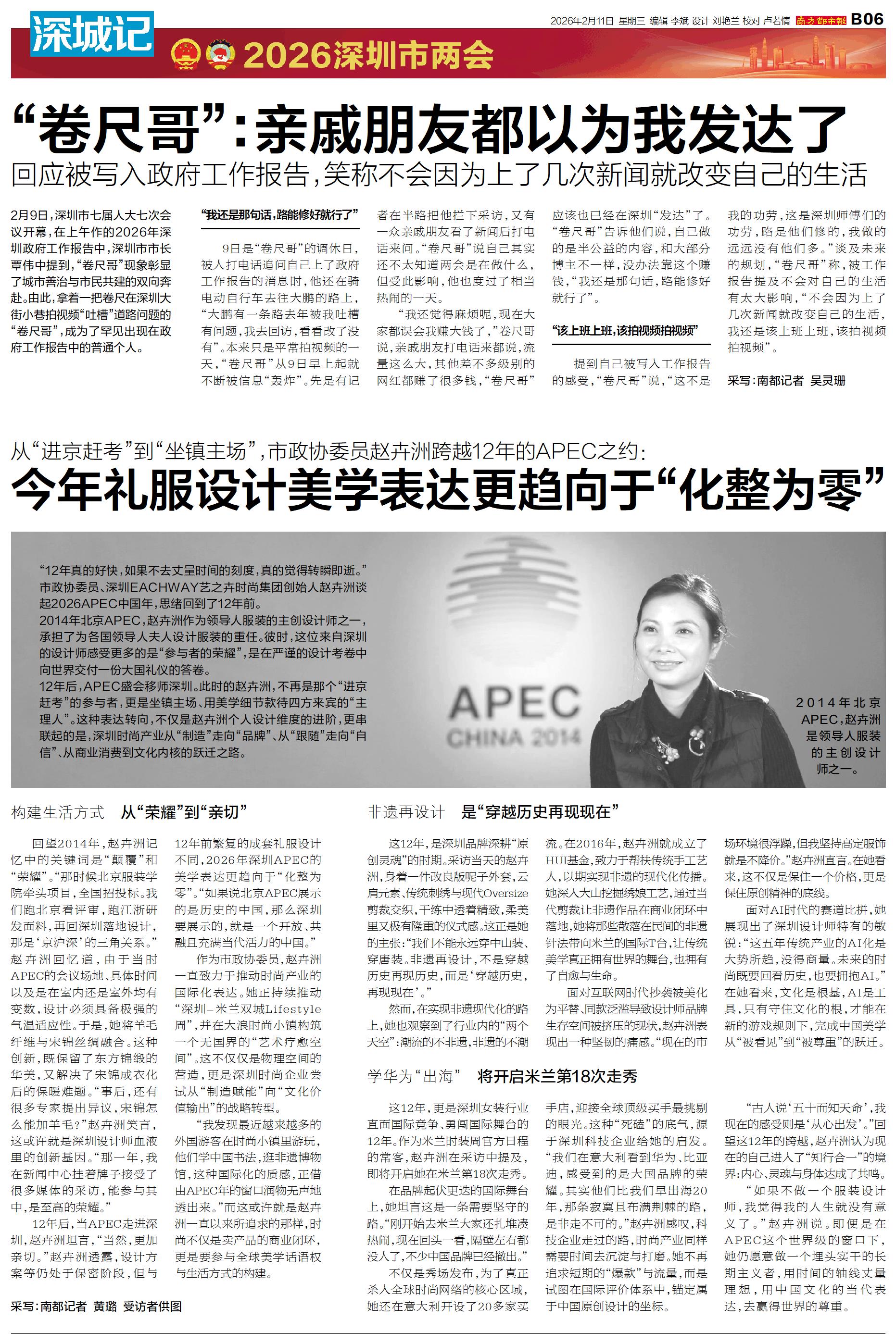 “12年真的好快,如果不去丈量时间的刻度,真的觉得转瞬即逝。”市政协委员、深圳EACHWAY艺之卉时尚集团创始人赵卉洲谈起2026APEC中国年,思绪回到了12年前。 2014年北京APEC,赵