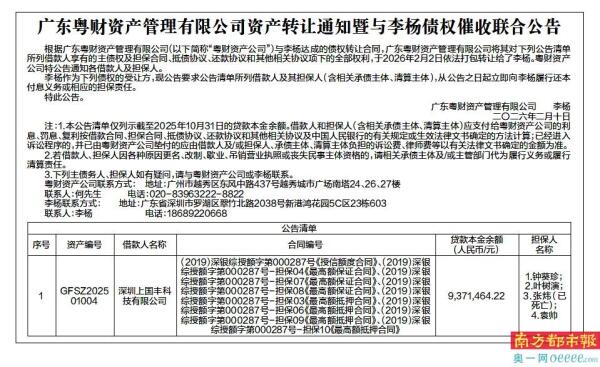 广东粤财资产管理有限公司资产转让通知暨与李杨债权催收联合公告