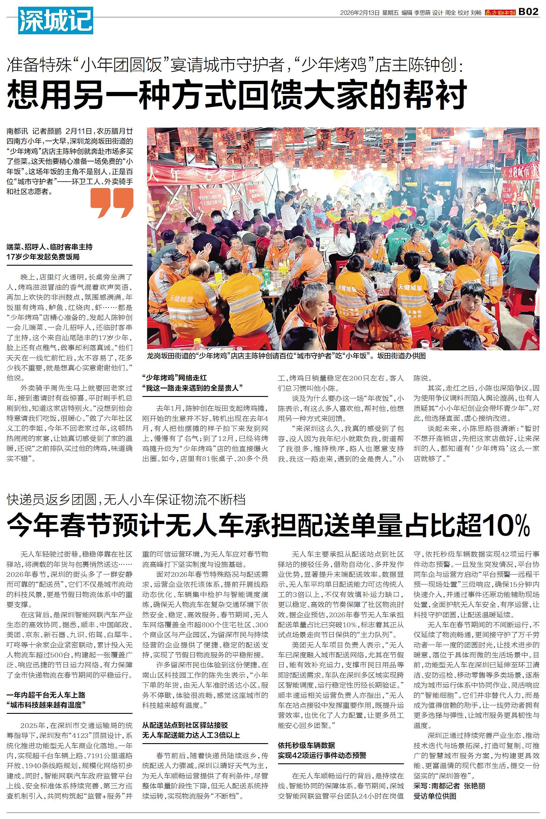 南都讯 记者颜鹏 2月11日,农历腊月廿四南方小年,一大早,深圳龙岗坂田街道的“少年烤鸡”店店主陈钟创就奔赴市场多买了些菜。这天他要精心准备一场免费的“小年饭”。这场年饭的主角不是别人,正是百位“