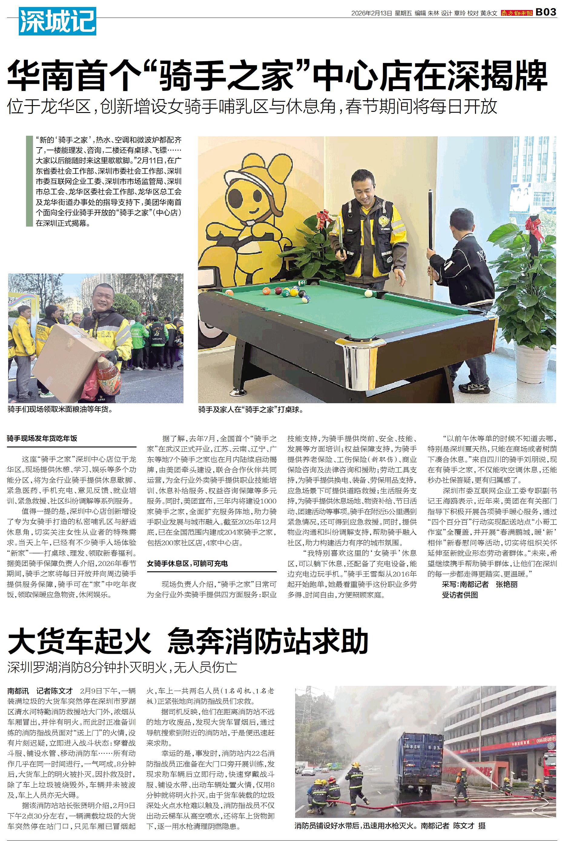 “新的‘骑手之家’,热水、空调和微波炉都配齐了,一楼能理发、咨询,二楼还有桌球、飞镖……大家以后能随时来这里歇歇脚。”2月11日,在广东省委社会工作部、深圳市委社会工作部、深圳市委互联网企业工委、