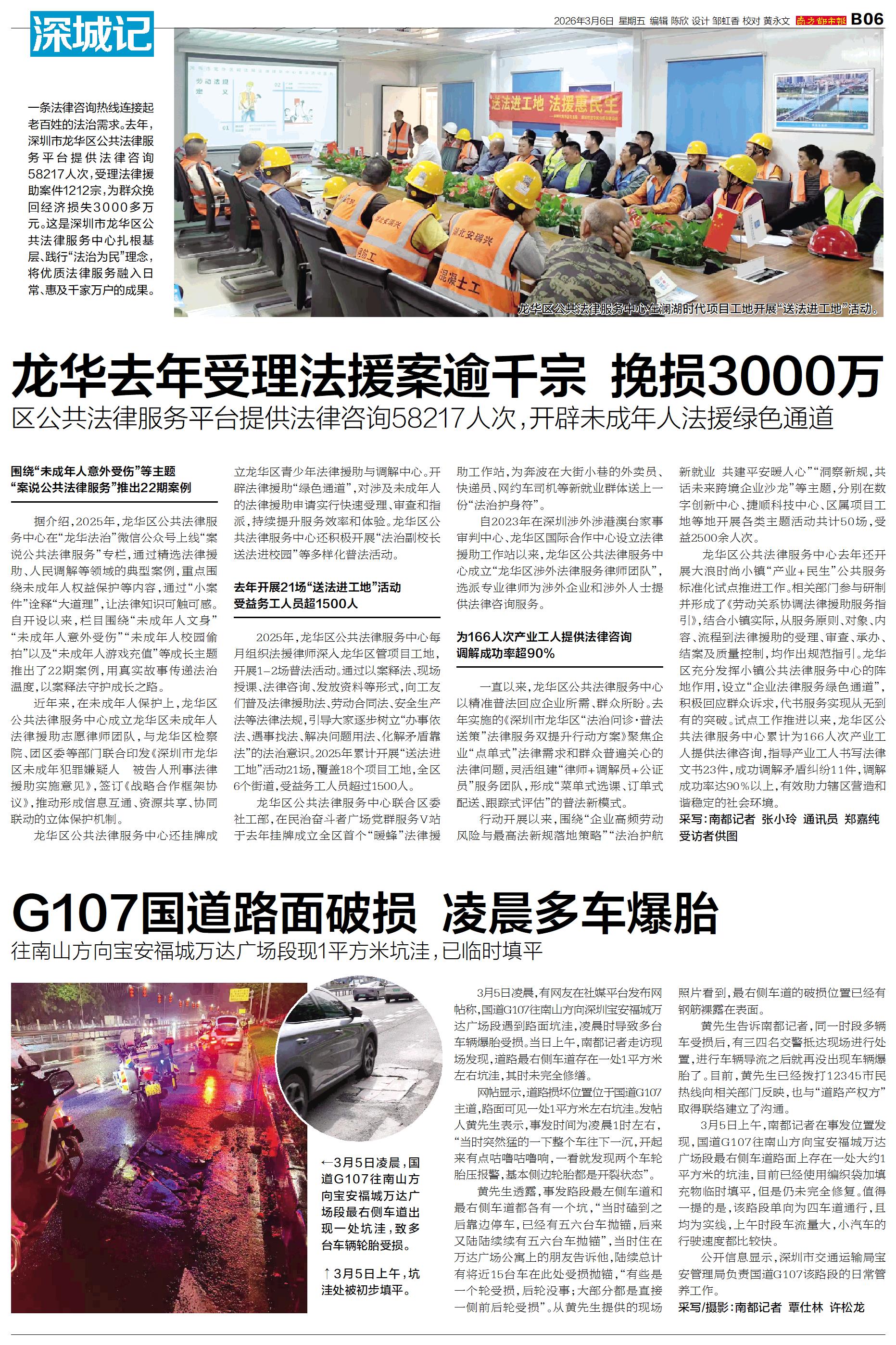 3月5日凌晨,有网友在社媒平台发布网帖称,国道G107往南山方向深圳宝安福城万达广场段遇到路面坑洼,凌晨时导致多台车辆爆胎受损。当日上午,南都记者走访现场发现,道路最右侧车道存在一处1平方米左右坑