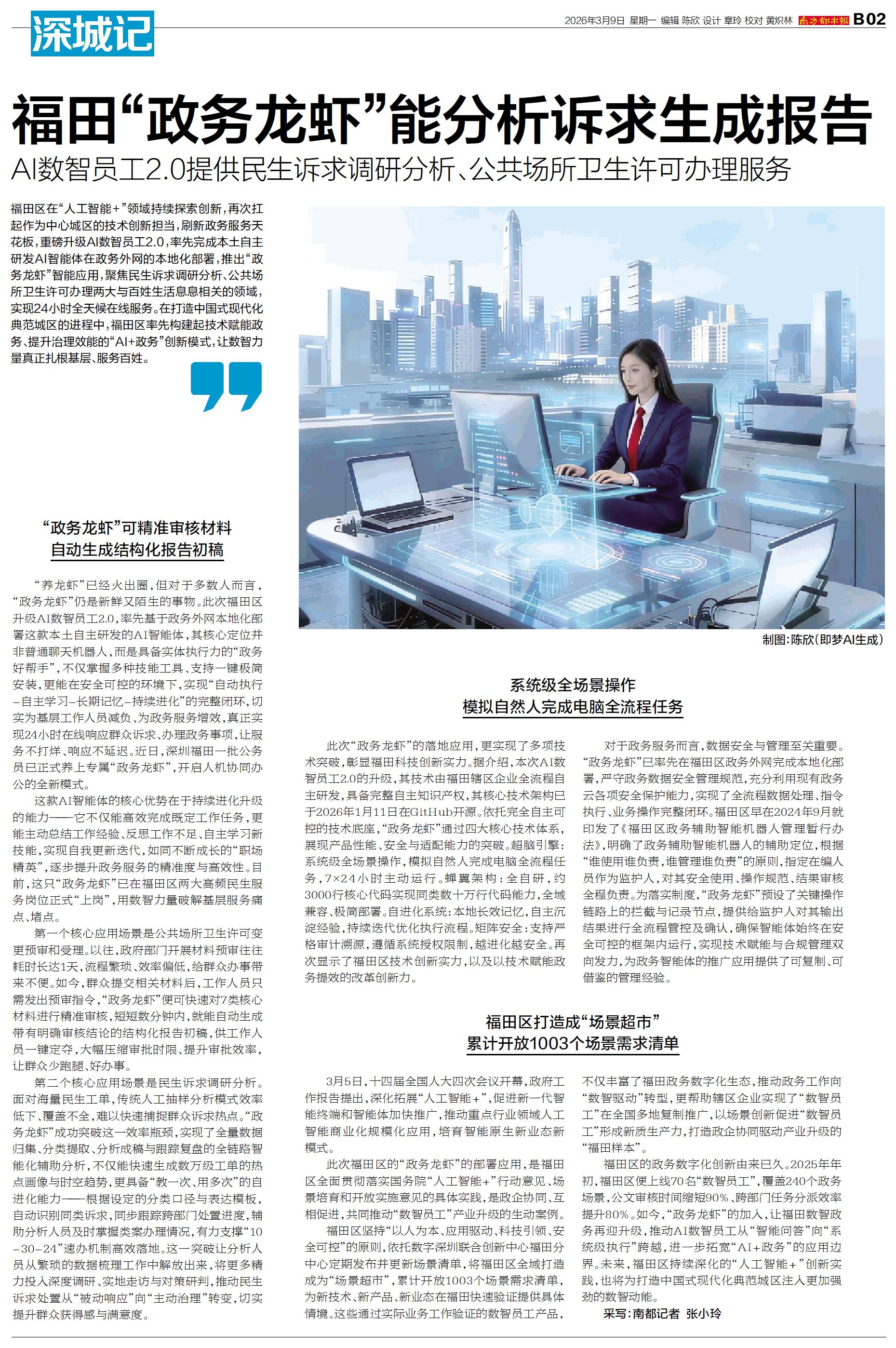 福田区在“人工智能+”领域持续探索创新,再次扛起作为中心城区的技术创新担当,刷新政务服务天花板,重磅升级AI数智员工2.0,率先完成本土自主研发AI智能体在政务外网的本地化部署,推出“政务龙虾”智