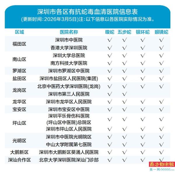 为保障伤者及时救治,深圳市急救中心已更新全市(含深汕合作区)抗蛇毒血清定点医院名单,覆盖所有行政区,可应对竹叶青、银环蛇、眼镜蛇等常见毒蛇咬伤。需要注意的是,抗蛇毒血清为特殊医疗资源,库存动态变化,紧急情况优先拨打120,由救护车送往具备救治能力的医院;自行前往需提前致电医院核实血清库存,避免耽误黄金救治时间。