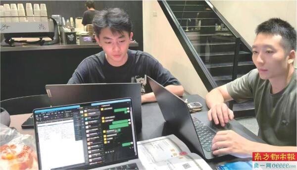 容海瑞(右)和团队成员讨论项目。