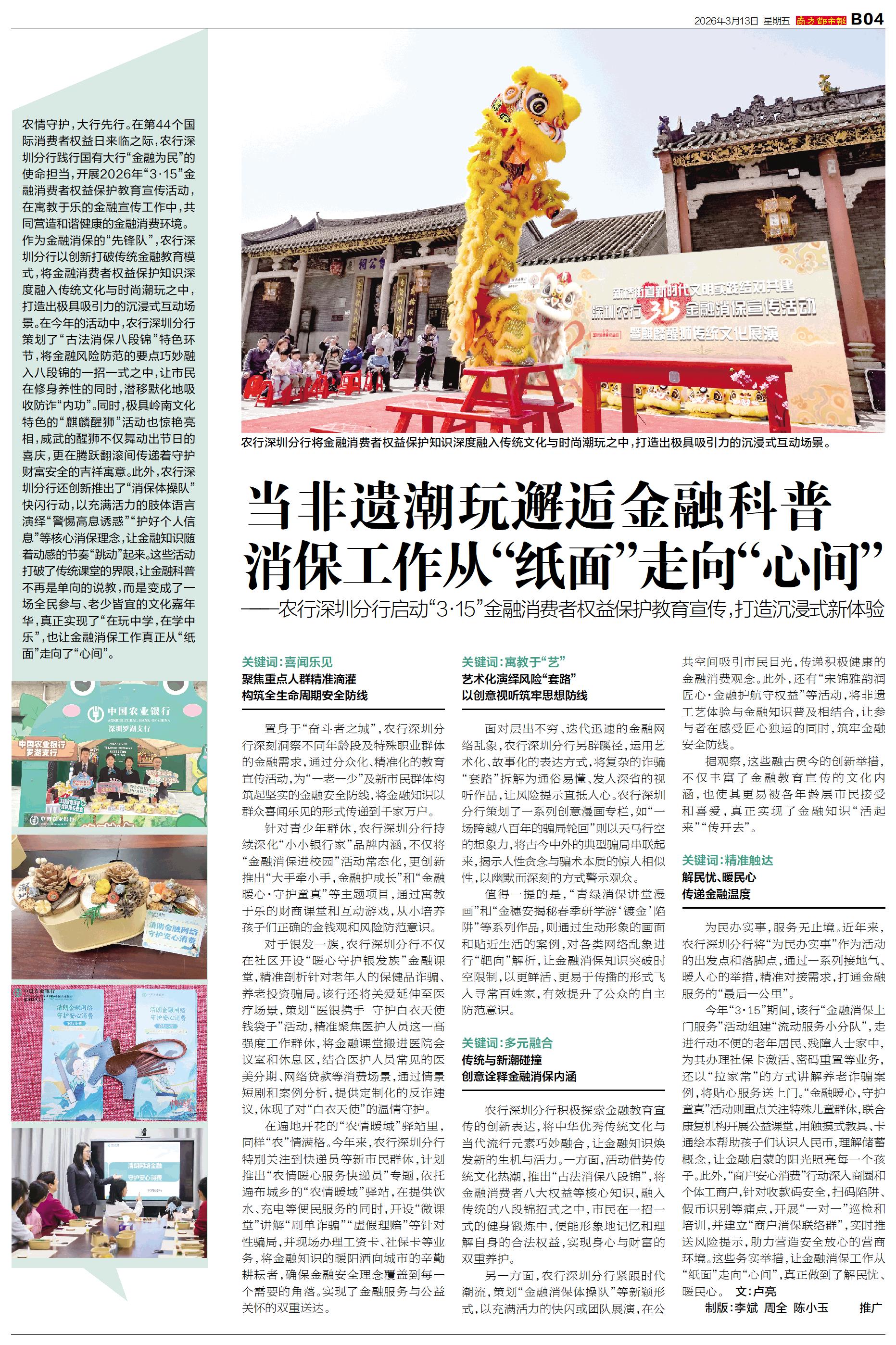 农情守护,大行先行。在第44个国际消费者权益日来临之际,农行深圳分行践行国有大行“金融为民”的使命担当,开展2026年“3·15”金融消费者权益保护教育宣传活动,在寓教于乐的金融宣传工作中,共同营