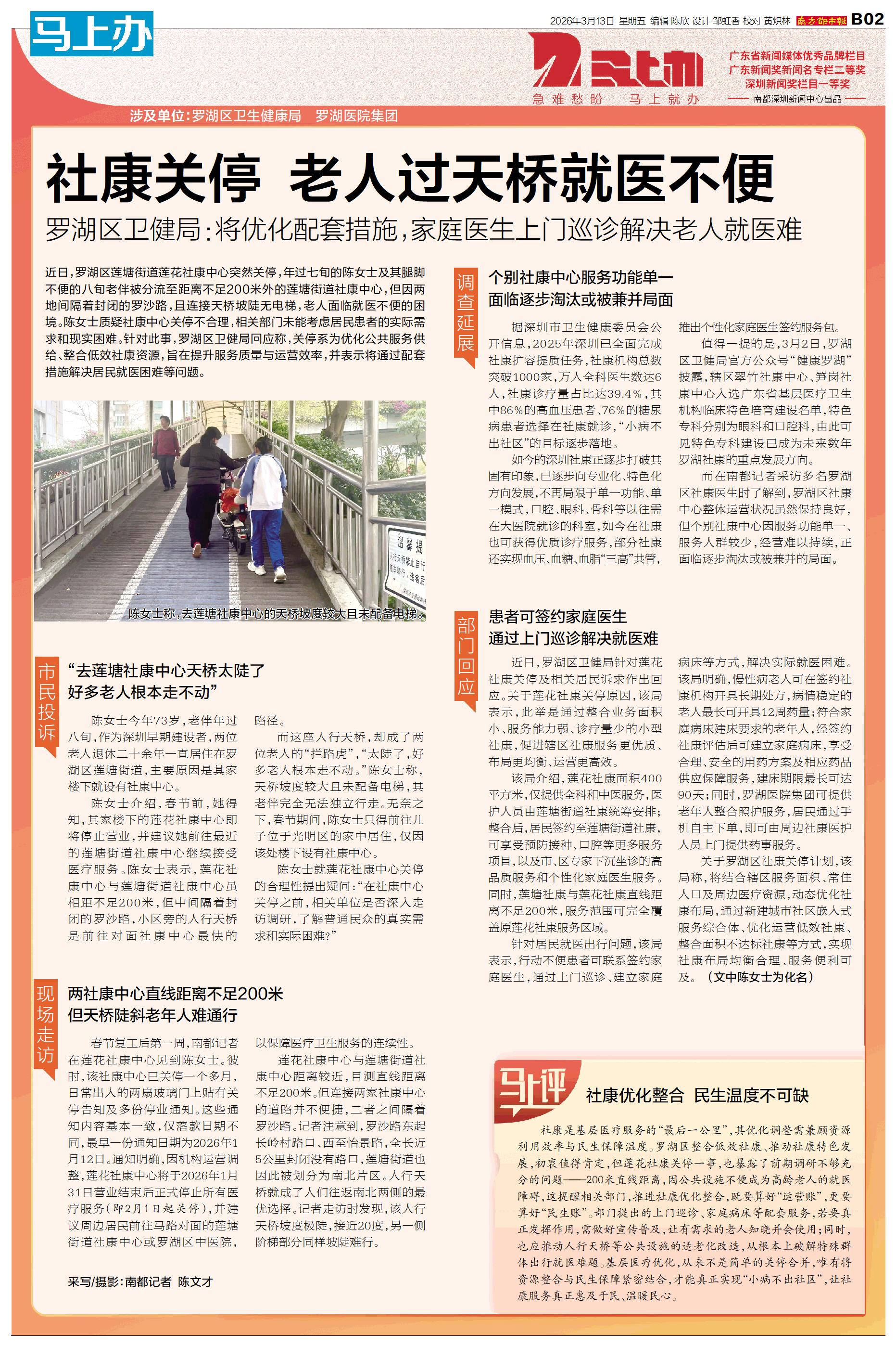 涉及单位:罗湖区卫生健康局罗湖医院集团 近日,罗湖区莲塘街道莲花社康中心突然关停,年过七旬的陈女士及其腿脚不便的八旬老伴被分流至距离不足200米外的莲塘街道社康中心,但因两地间隔着封闭的罗沙路,