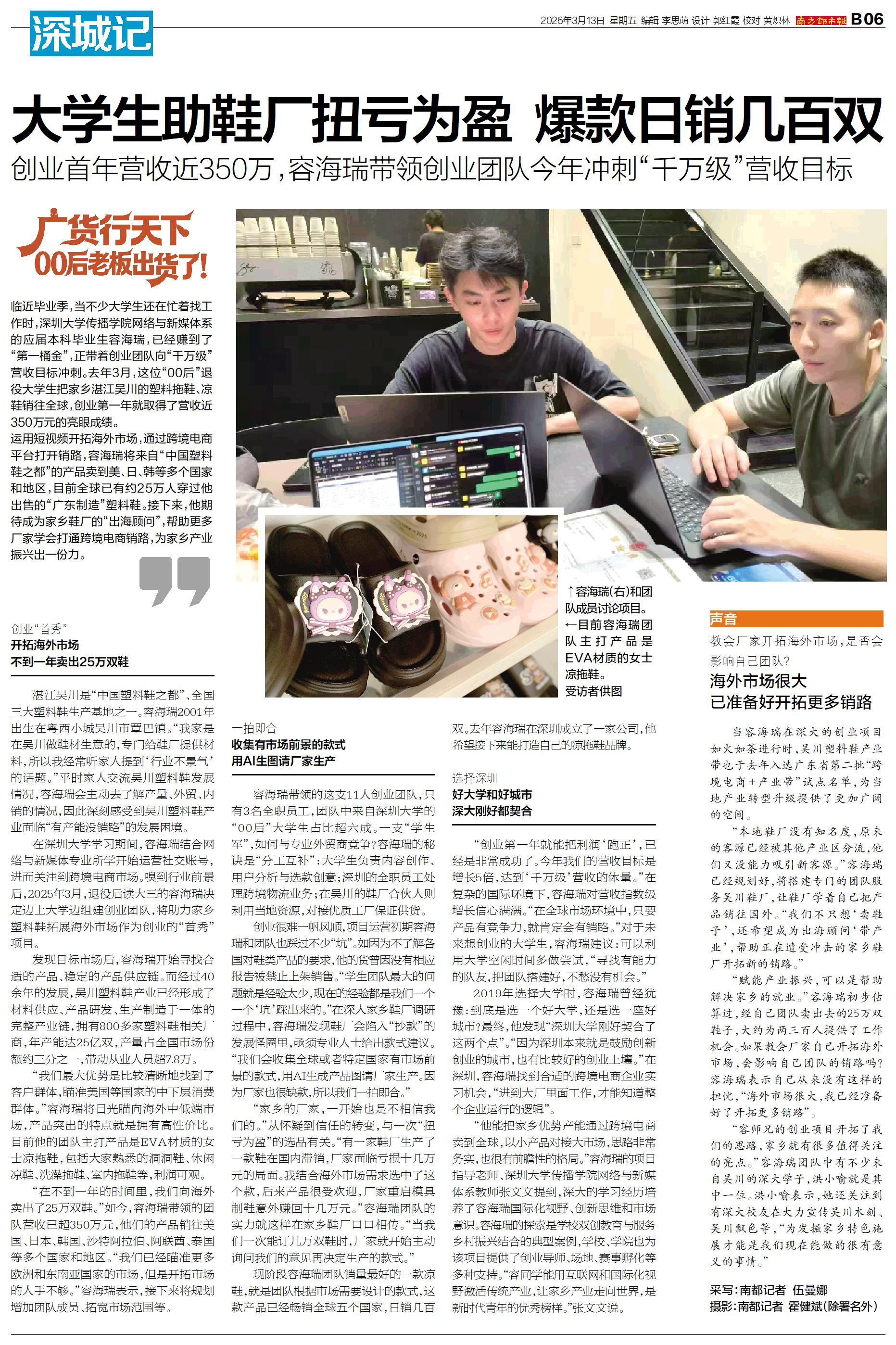 临近毕业季,当不少大学生还在忙着找工作时,深圳大学传播学院网络与新媒体系的应届本科毕业生容海瑞,已经赚到了“第一桶金”,正带着创业团队向“千万级”营收目标冲刺。去年3月,这位“00后”退役大学生把