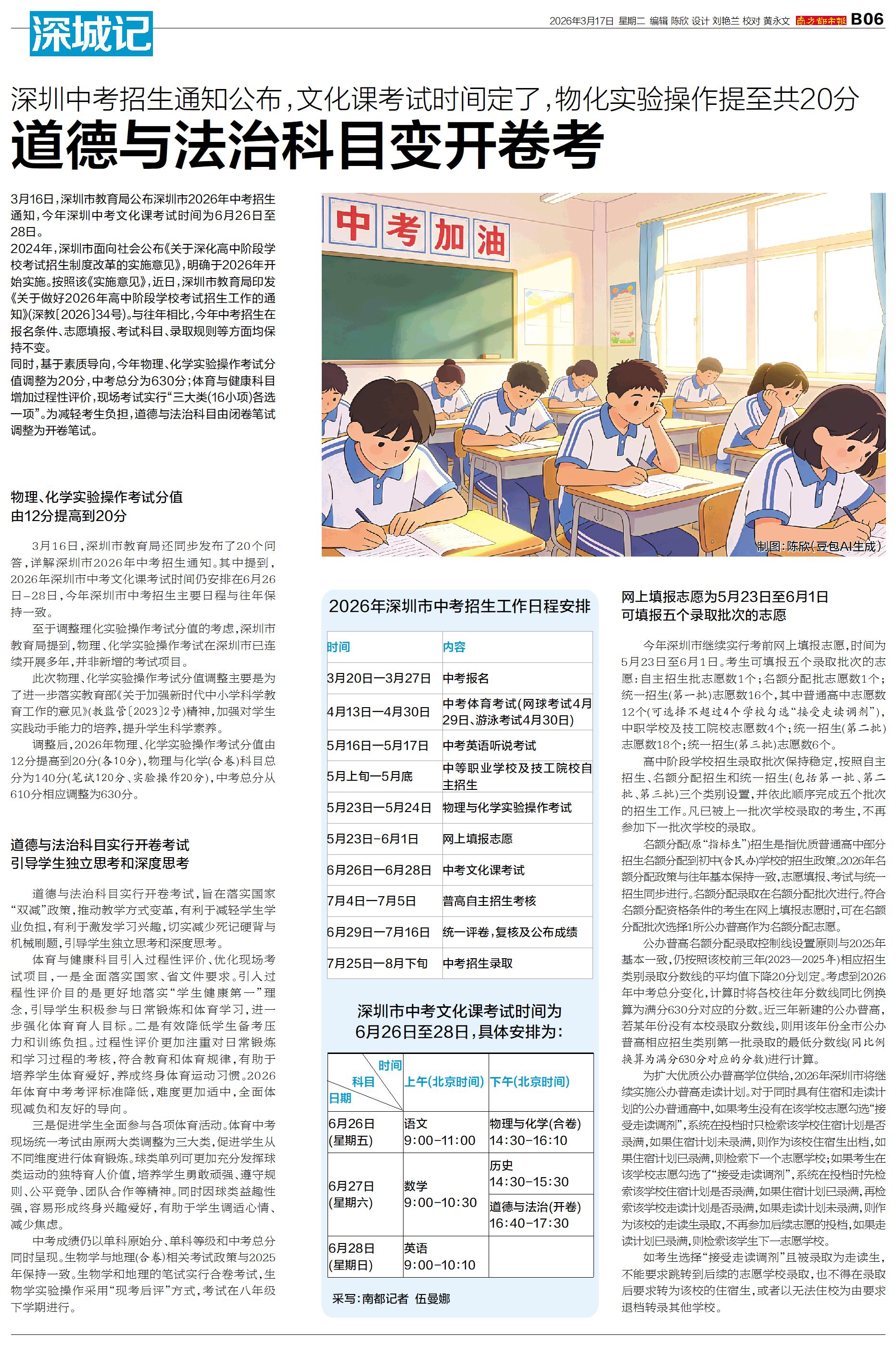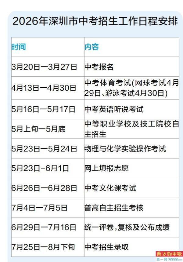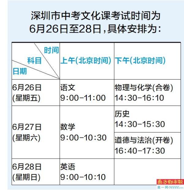 3月16日,深圳市教育局公布深圳市2026年中考招生通知,今年深圳中考文化课考试时间为6月26日至28日。