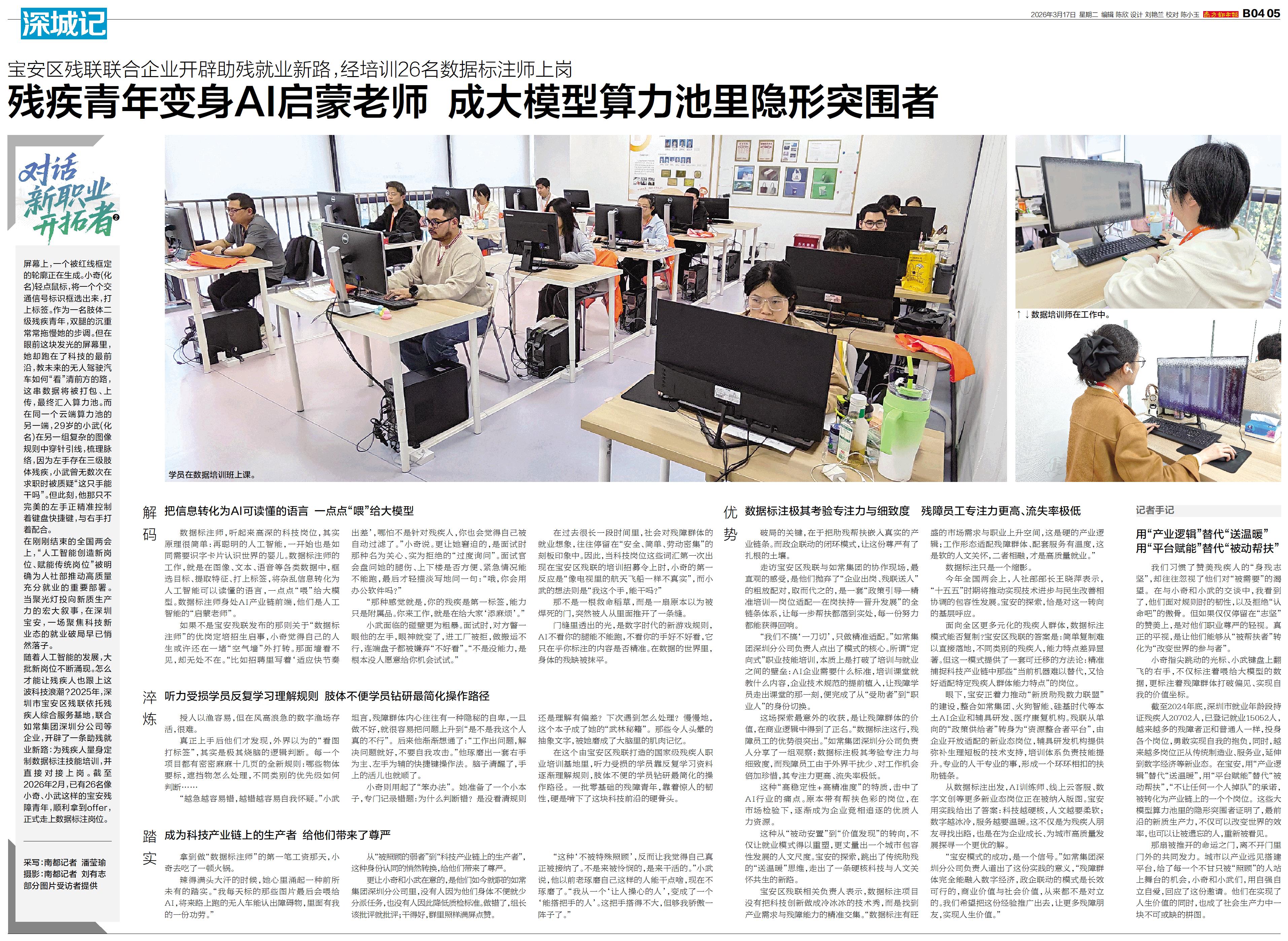 屏幕上,一个被红线框定的轮廓正在生成。小奇(化名)轻点鼠标,将一个个交通信号标识框选出来,打上标签。作为一名肢体二级残疾青年,双腿的沉重常常拖慢她的步调。但在眼前这块发光的屏幕里,她却跑在了科技的