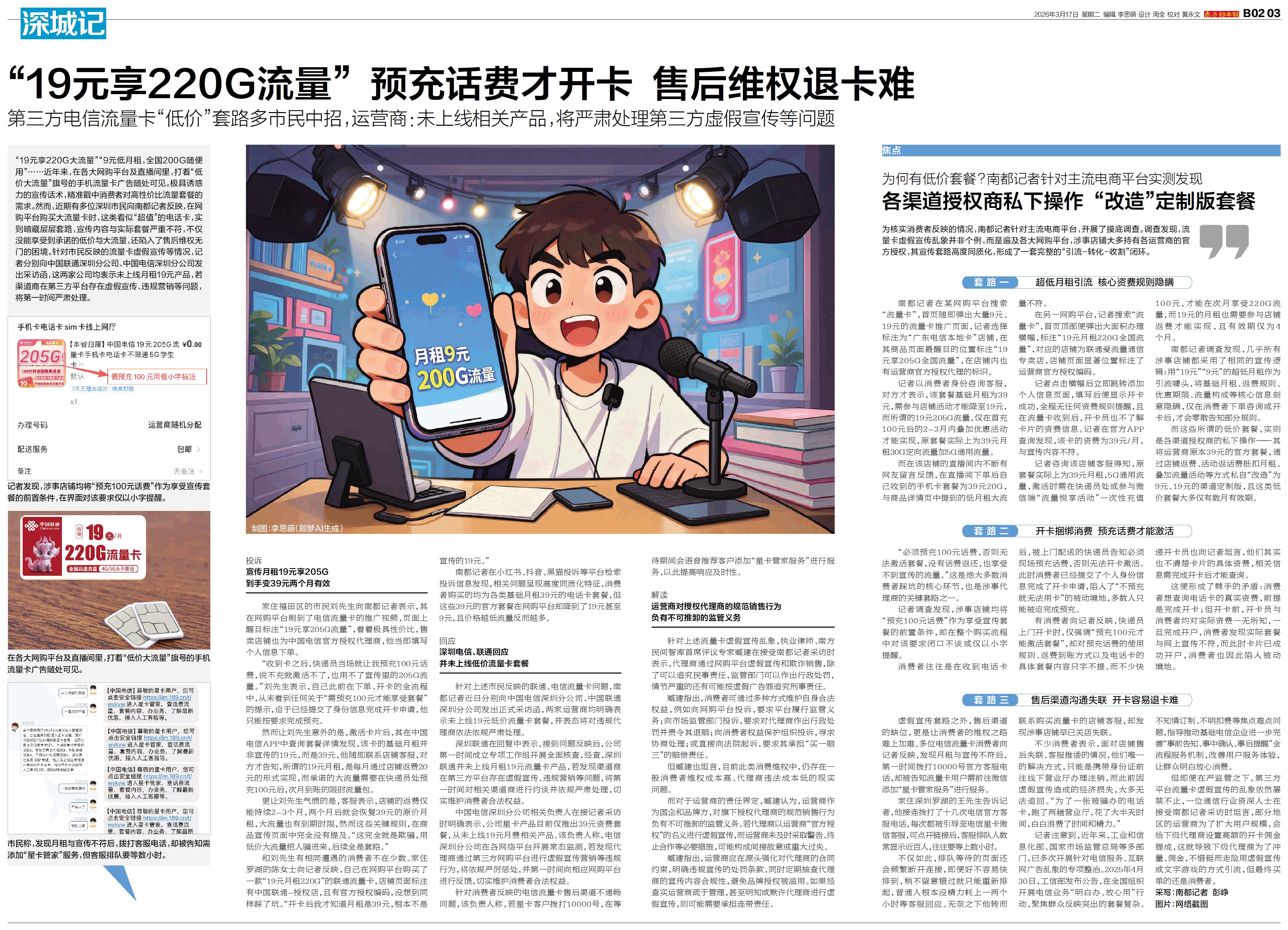 “19元享220G大流量”“9元低月租,全国200G随便用”……近年来,在各大网购平台及直播间里,打着“低价大流量”旗号的手机流量卡广告随处可见。极具诱惑力的宣传话术,精准戳中消费者对高性价比流量