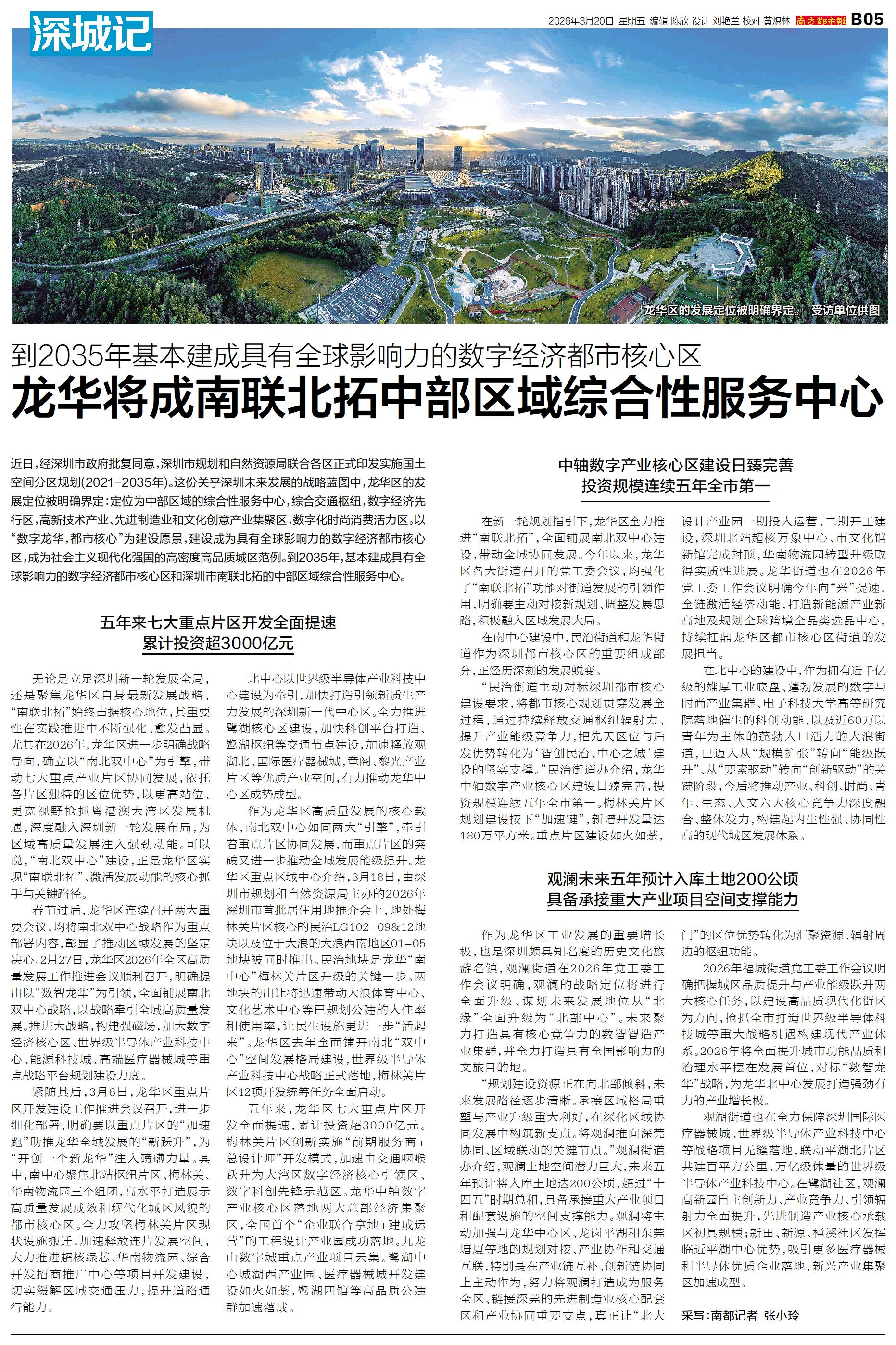 “民治街道主动对标深圳都市核心建设要求,将都市核心规划贯穿发展全过程,通过持续释放交通枢纽辐射力、提升产业能级竞争力,把先天区位与后发优势转化为‘智创民治、中心之城’建设的坚实支撑。”民治街道办介绍,龙华中轴数字产业核心区建设日臻完善,投资规模连续五年全市第一。梅林关片区规划建设按下“加速键”,新增开发量达180万平方米。重点片区建设如火如荼,设计产业园一期投入运营、二期开工建设,深圳北站超核万象中心、市文化馆新馆完成封顶,华南物流园转型升级取得实质性进展。龙华街道也在2026年党工委工作会议明确今年向“兴”提速,全链激活经济动能,打造新能源产业新高地及规划全球跨境全品类选品中心,持续扛鼎龙华区都市核心区街道的发展担当。