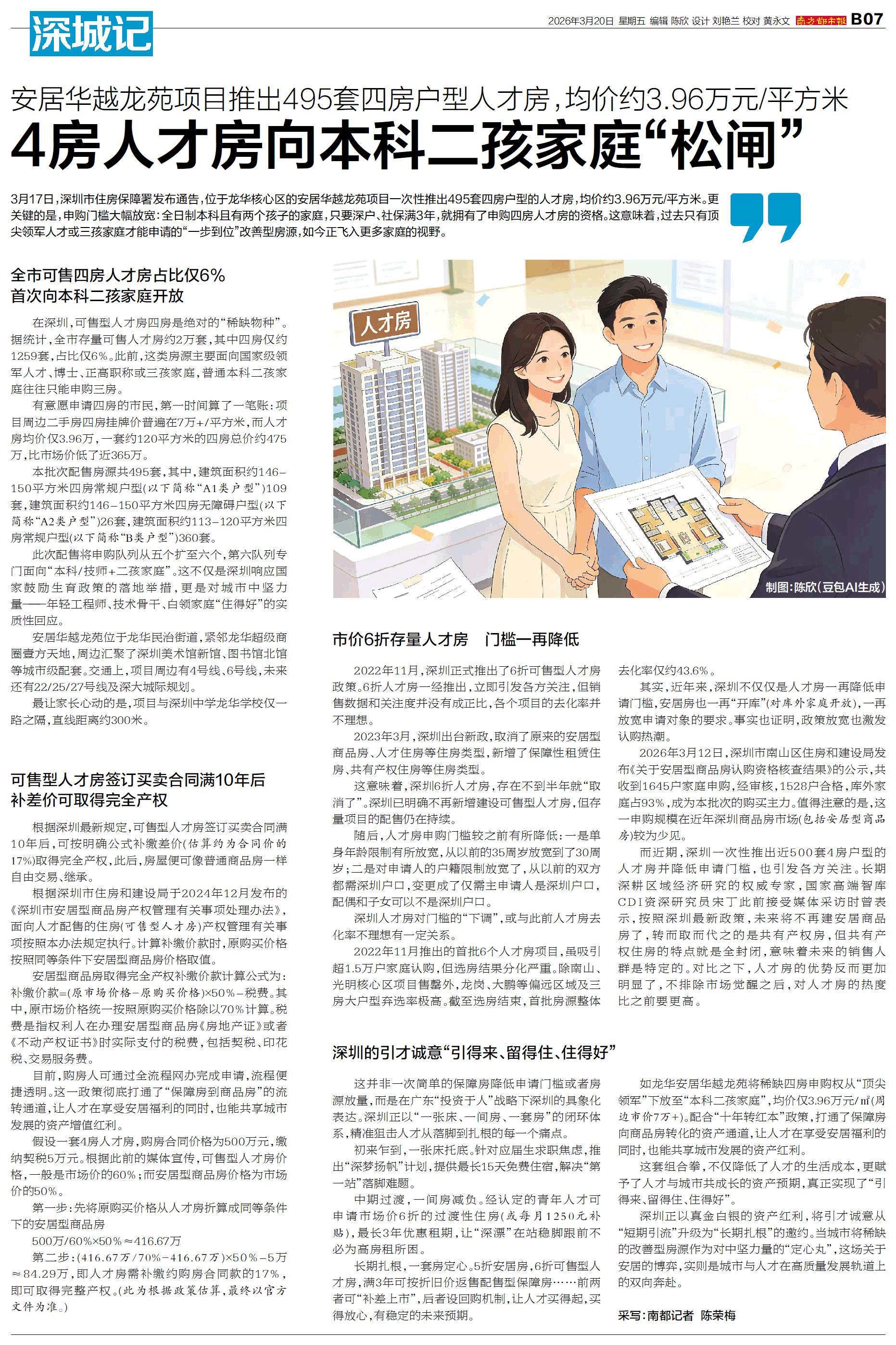 3月17日,深圳市住房保障署发布通告,位于龙华核心区的安居华越龙苑项目一次性推出495套四房户型的人才房,均价约3.96万元/平方米。更关键的是,申购门槛大幅放宽:全日制本科且有两个孩子的家庭,只