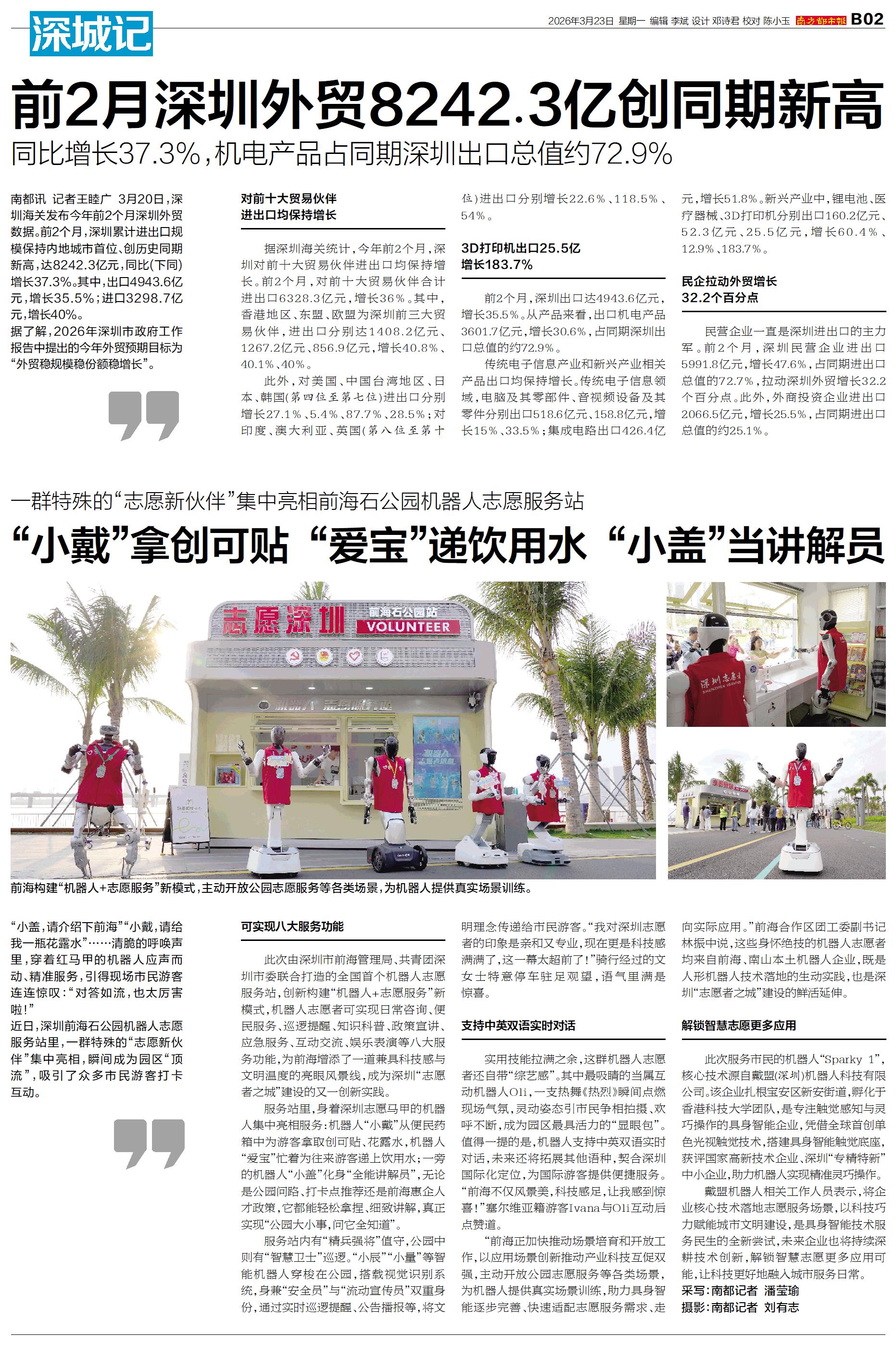 “小盖,请介绍下前海”“小戴,请给我一瓶花露水”……清脆的呼唤声里,穿着红马甲的机器人应声而动、精准服务,引得现场市民游客连连惊叹:“对答如流,也太厉害啦!”